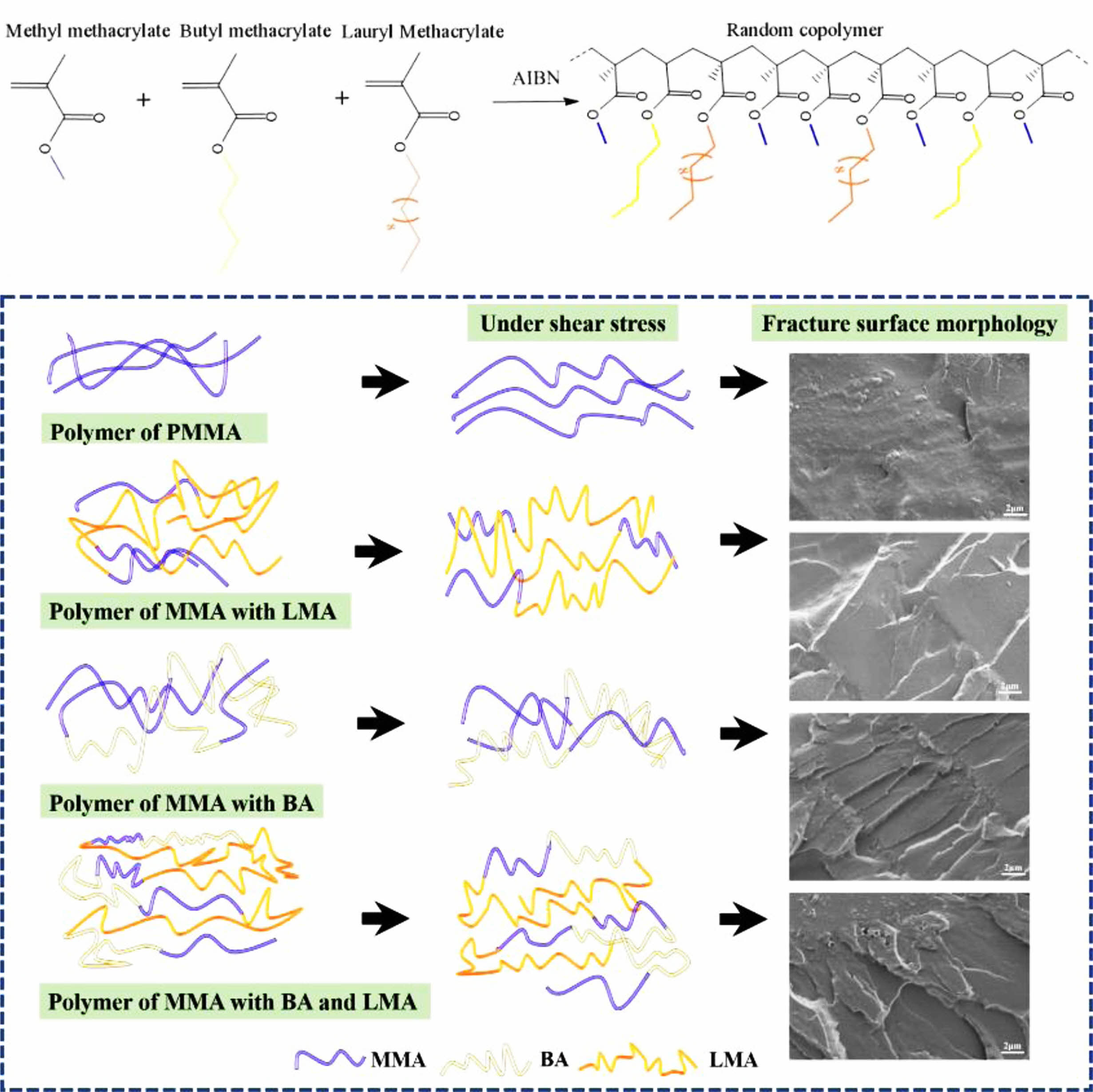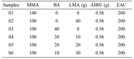 Materials. Methyl methacrylate (MMA) [99.0%, containing 30 ppm MEHQ stabilizer], butyl acrylate (BA) [AR, 99%], lauryl methacrylate (LMA) [96%, containing 500 ppm MEHQ stabilizer], and ethyl acetate (EAC) [AR, 99.5%] were all purchased from Aladdin (Shanghai) Co., China. Azobisisobutyronitrile (AIBN) was purified and recrystallized by using ethanol.