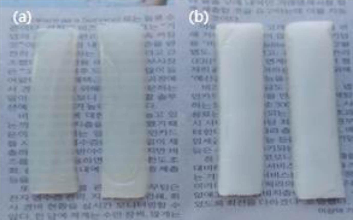 Figure 2 Cured adhesive specimen using (a) F-ISB; (b) F-PTMEG. |