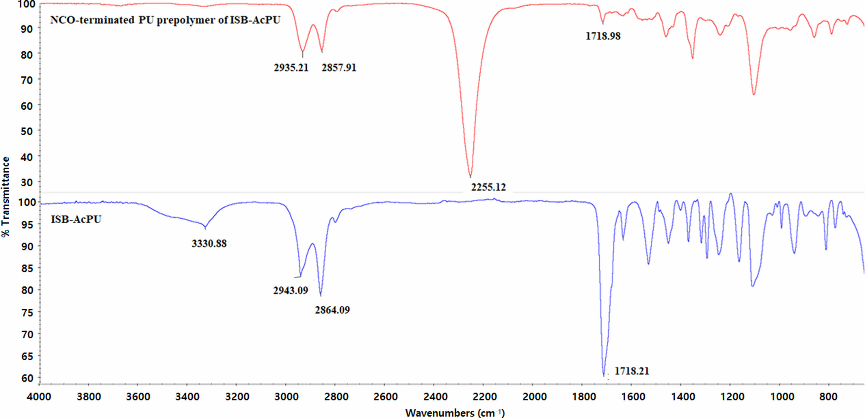 Figure 5 FTIR Spectrum of ISB-AcPU and its synthetic intermediate (NCO terminated PU prepolymer) |