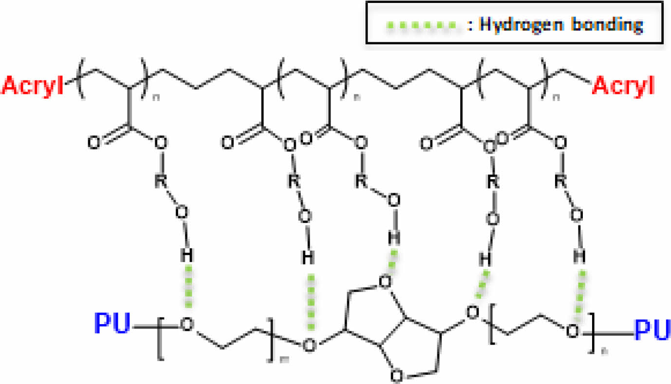 It is thought that the basis of the high adhesive formulation between acrylate and urethane chains is from the improved hydrogen bonding. As shown in the schematic diagram in Figure 6, several ether functional groups derived from EI-5 increase cohesion through hydrogen bonding with hydroxyl functional groups from 2-HEMA, which plays a key role in reinforcing cohesion of the adhesive cured product.