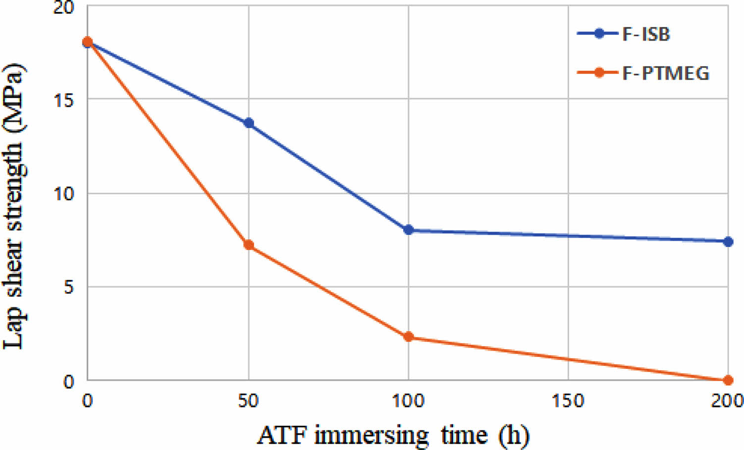 We developed a simplified method for the durability testing as follows. After immersing the specimen samples manufactured as 2.5 in ATF oil in 2 L flask, the oil was heated at 180 °C for 200 h, while identifying the tendency of adhesion decline. As can be seen in Figure 9, it was verified that the adhesive (F-ISB) to which EI-5 is applied implemented better oil resistance than F-PTMEG, and we concluded that the better oil durability is due to the hydrophilicity of the adhesive cured surface originated from EI-5.