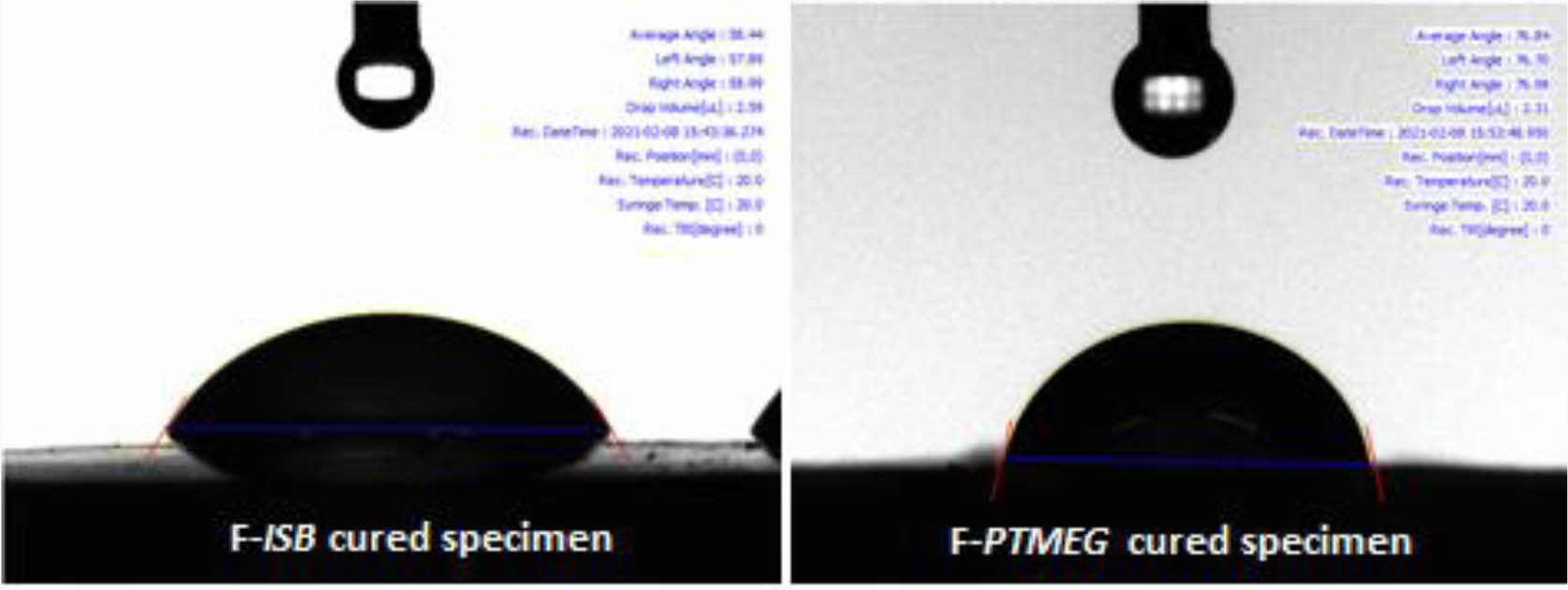 To verify whether the surface of the adhesive cured product is hydrophilic, the contact angle using distilled water was measured as described in 2.6 (Table 6). As can be seen in Figure 10, it was identified that the surface of F-ISB was more hydrophilic than that of F-PTMEG, which explains the better oil resistance of F-ISB.