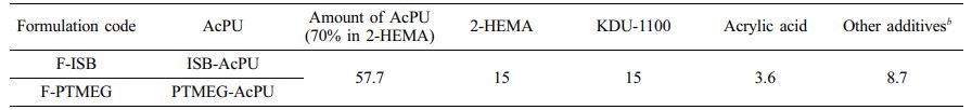 Synthesis of Poly(tetrahydrofuran) (PTMEG) Based Acrylate Modified Polyurethanes as a Control (PTMEG-AcPU). By using poly(tetrahydrofuran) 1000 (PTMEG 1000, Aldrich, USA) (950 g; 0.95 mol) instead of EI-5, PTMEG-AcPU was obtained by the same method as ISB-AcPU in 2.2 as described in Figure 1 to give PTMEG based AcPU (PTMEG-AcPU) as 70 wt% solution in 2-HEMA as opaque white liquid.