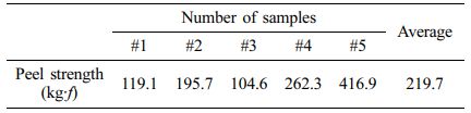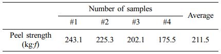 The thermal shock test of dot-bonded stator core, to which the EI-5 based adhesive was applied as described in 2.9 was performed, and thermal stability was evaluated through the peel strength test. As a result, average peel strength of more than 200 kg∙f or more was confirmed, which far exceeds the specification (10 kg∙f) required by automobile manufacturers.