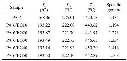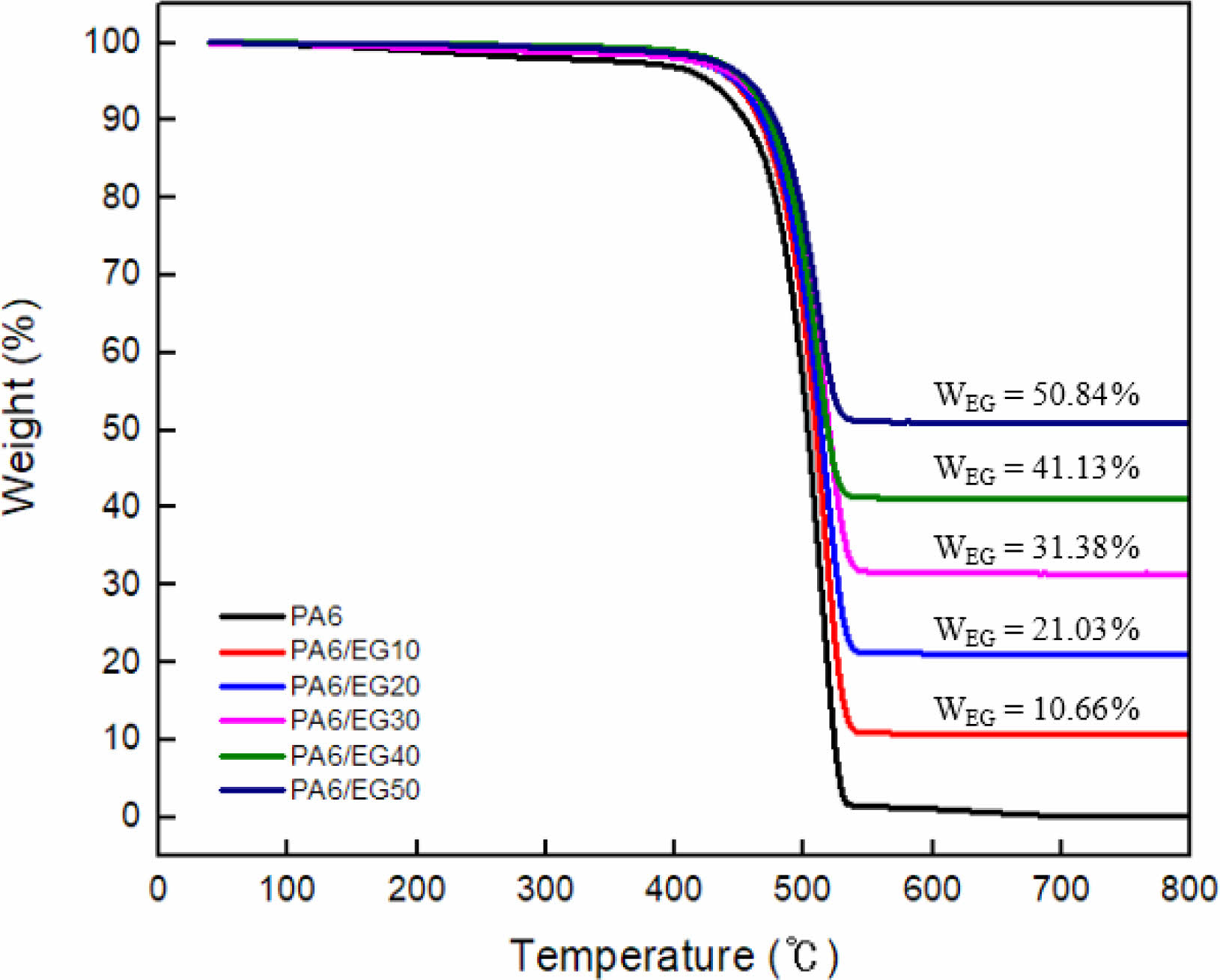 Figure 1과 Table 1은 PA 6/EG 복합체의 TGA, DSC, 비중측정 결과이다. 필러 함량별에 따라 제조된 복합체의 EG 함량분석은 TGA를 이용하여 측정하였고, 실제 투입된 10, 20, 30, 40, 50 wt%와 큰 차이를 보이지 않았다. 분해 온도(Td)는 전체 무게에서 무게 손실이 약 5%가 되었을 때를 측정한 것으로 PA 6의 경우 423 oC에서 관찰되었고, EG 함량이 증가할수록 440-452 oC로 PA 6 대비 약 20 oC 정도 증가하였다. 이는 열이력에 따른 열안정성 효과를 보여준다. 결정성 고분자의 결정화 및 용융거동 관찰을 위해 DSC를 측정한 결과 결정화 온도(Tc)의 경우 PA는 168.36 oC에서 관찰되었고, 10-50 wt%의 EG가 첨가된 PA 6/EG 복합체는 193 oC 부근에서 관찰되었으며 PA대비 온도가 크게 증가하였다. 이는 첨가된 EG가 불균일 핵제로 작용된 것으로 유추 가능하며,19 함량에 따른 변화는 관찰되지 않았다. 용융 온도(Tm)의 경우는 222 oC(±5) 부근에서 관찰되었고 큰 변화는 없었다. 이는 복합체 내에 필러가 불균일 핵제로 작용하여 결정화온도에는 영향을 주지만 용융온도에 영향을 미치는 결정구조 또는 결정화과정에는 큰 변화가 없기 때문으로 판단된다.20 함량이 높아질수록 비중은 증가하였다.
