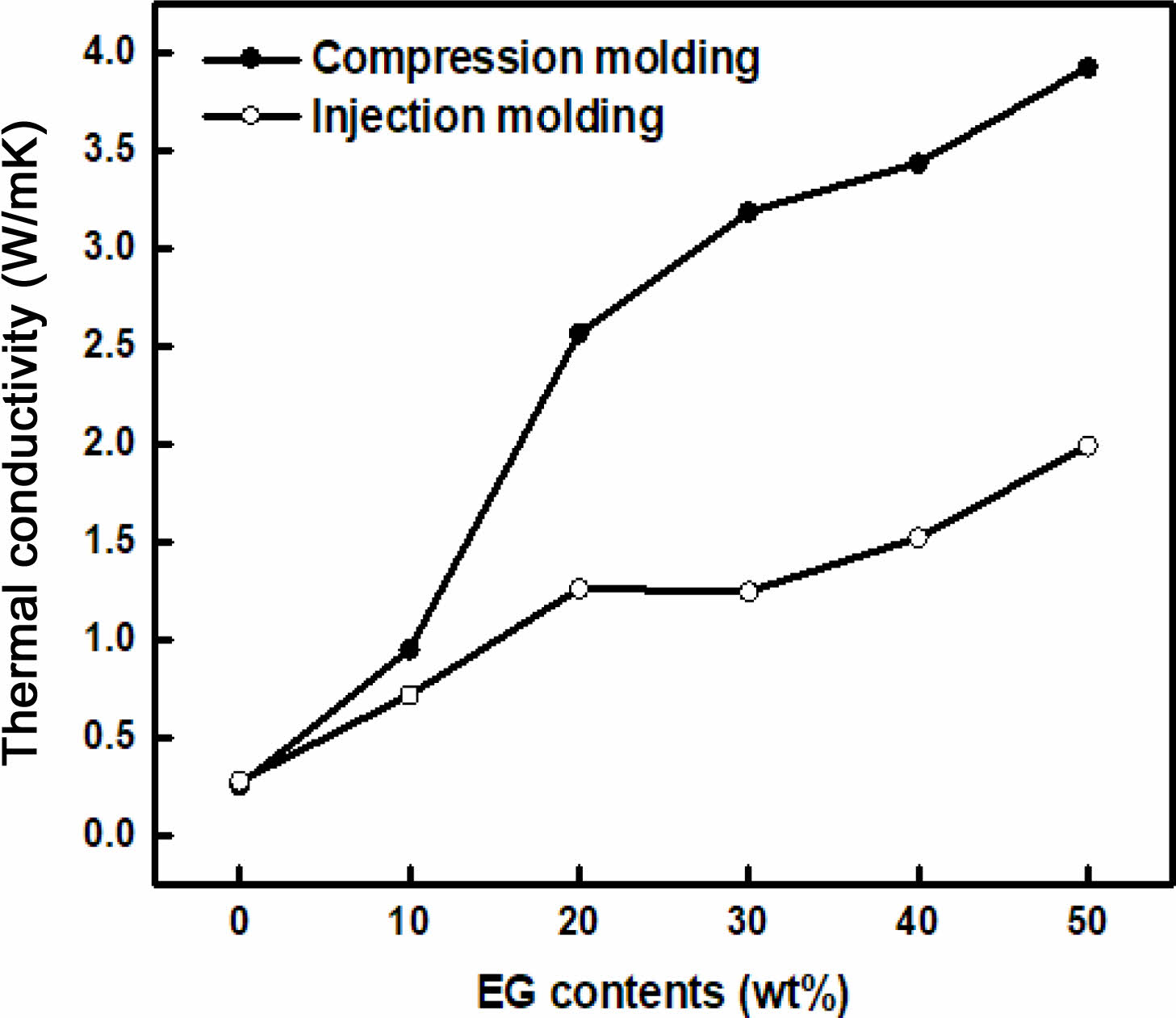 Figure 3 Thermal conductivity comparison between compression molding and injection molding of PA 6/EG composites. |