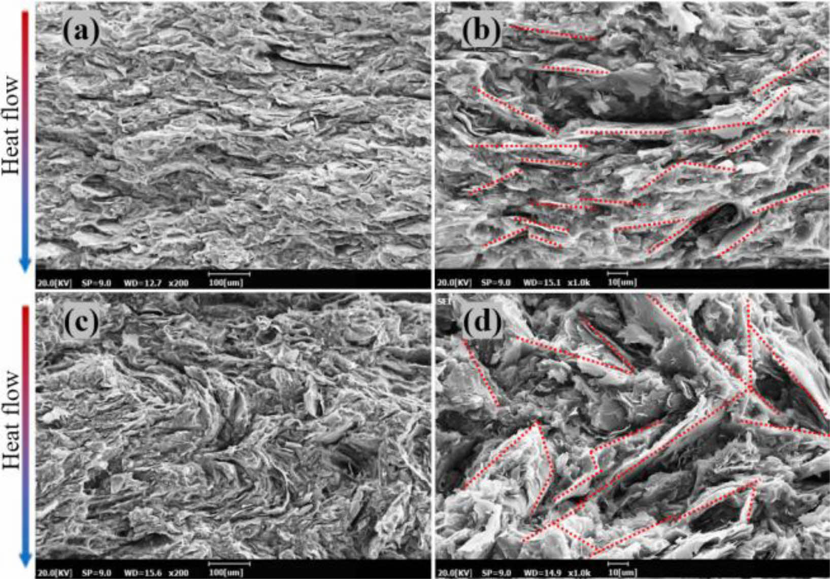 Figure 2는 성형방법(압축성형, 사출성형)에 따른 열전도 특성을 비교하기 위해 제조된 PA 6/EG 복합체의 열전도도 시험 시편을 제시하였고, Figure 3은 성형방법과 EG 함량에 따른 열전도도를 나타낸 것이다. PA 6/EG 복합체는 가공상의 어려움으로 인해 EG의 함량은 50 wt%로 제한되었다. 압축성형(compression molding) 및 사출성형(injection molding) 시편은 EG 함량이 많아질수록 열전도도가 증가하는 경향을 보였으며, 함량이 높아질수록 필러들 사이의 입자 간격이 줄어들며 접촉면적이 증가한 것으로 유추할 수 있다. 성형방법에 따른 열전도도 차이는 PA 6의 열전도도 대비 EG 50 wt% 기준으로 압축성형 시편의 경우 약 3.926 W/mK로 15배, 사출성형의 경우 1.991 W/mK로 약 7배 상승되었다. 사출성형 시편에 비해서 압축성형 시편이 모든 함량에서 높은 열전도도를 보이는 것은 성형 방법에 따른 EG의 배향에 의한 것으로 보인다. Figure 4의 성형 방법에 따른 시편 파단면 SEM 이미지에서 사출성형 시편 (a)와 (b)는 EG가 사출방향으로 배향되었고, 압축성형 시편 (c)와 (d)는 EG가 랜덤하게 배열된 것을 확인할 수 있다. 사출성형의 경우 EG가 측정면에 수직한 방향으로 배향되었고, 압축성형은 성형과정에서 사출성형과 같이 일정방향으로 전단력이 작용하지 않기 때문에 필러의 배향이 크게 나타나지 않아 랜덤 배열의 형태학적 특성을 나타내 수평, 수직 방향이 모두 존재하여 열전도 네트워크를 형성하므로 열전도도가 높아진 것으로 해석할 수 있다. 이는 필러들이 네트워크를 형성할 수 있는 함량 수준, 공간적 배열 및 방향이 열전도도에 강한 영향을 미치고 있음을 확인 할 수 있었다.21
