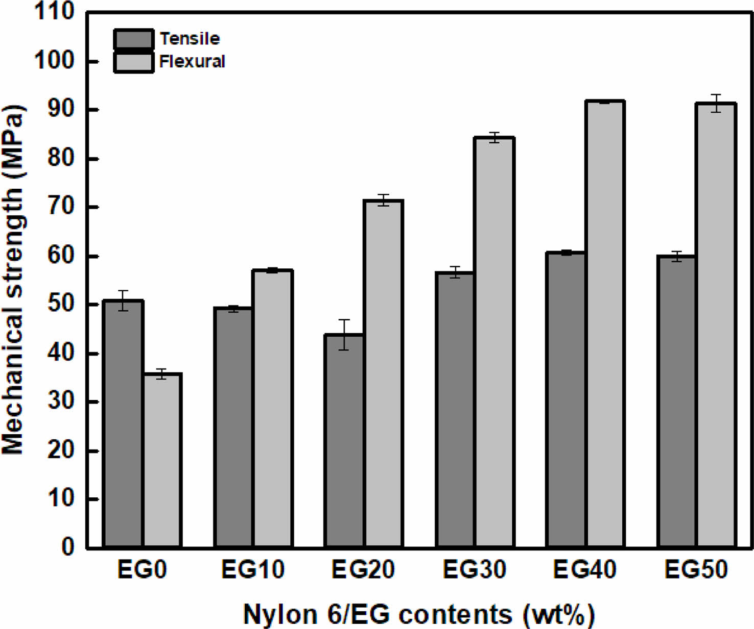 Figure 5 Mechanical properties of PA 6/EG composites: (a) tensile strength; (b) flexural strength. |