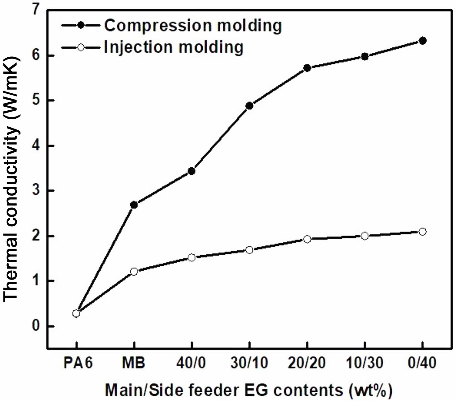 Figure 6 Thermal conductivity comparison between compression molding and injection molding of PA 6/EG composites by main/side feeder content and master batch. |