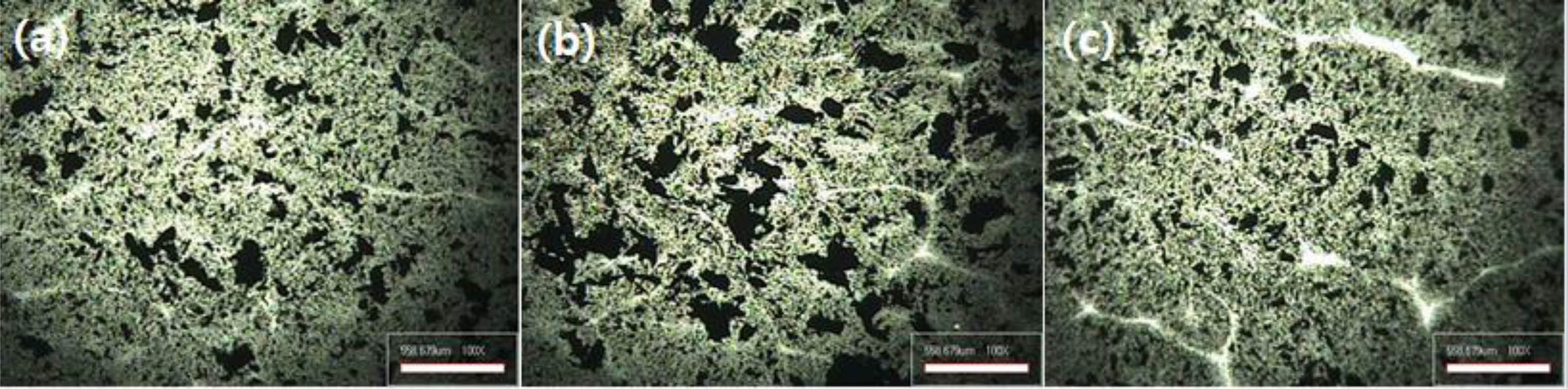Figure 7 OM image of (a) main 40 wt%; (b) side 40 wt%; (c) MB 40 wt%. |
