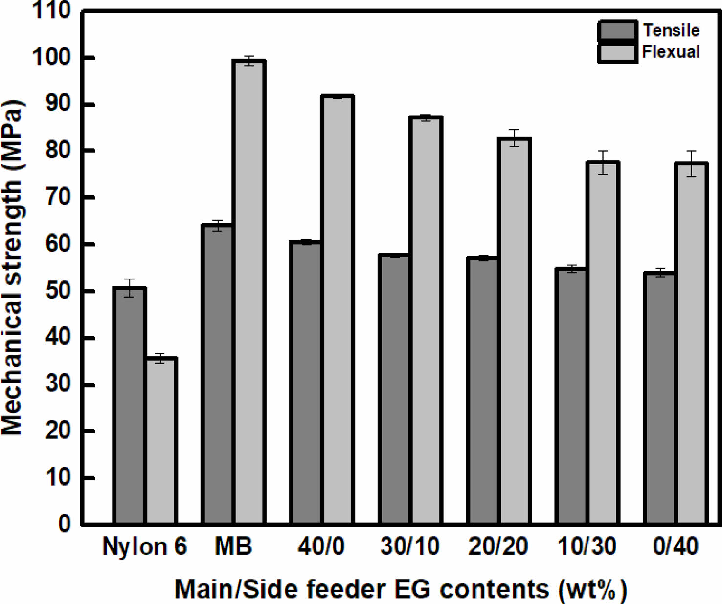 Figure 8은 EG 40 wt%를 주/부투입비가 다른 PA 6/EG 복합체 및 MB가 적용된 복합체의 사출성형 시편의 기계적 인장 및 굴곡 강도를 나타낸 것이다. 주투입구에서 부투입구의 비율이 높아질수록 인장 및 굴곡강도는 감소되었으나, PA 6보다 인장 및 굴곡 강도는 우수하였다. MB가 적용된 복합체의 경우에는 열전도도는 낮았지만 기계적 강도는 우수하게 나타났다. 부투입구에서 EG 투입비율이 높아질수록 주투입구에 비해 고분자와 혼합되는 시간이 짧아져서 EG와의 혼련성이 낮아 기계적물성이 낮아지는 것으로 예측된다. 하지만 부투입구에 40 wt% EG가 모두 투입된 경우도 산업용 열전도 소재로 사용하기에는 충분한 물성으로 판단된다.