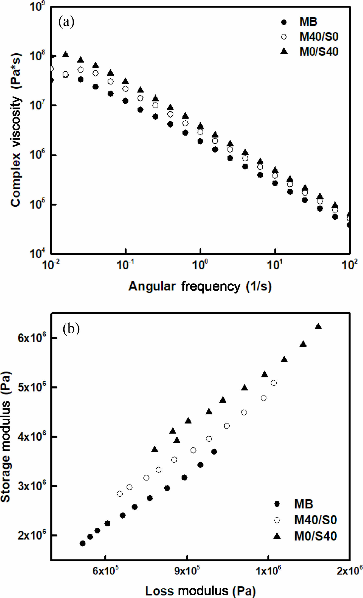 Figure 9(a)는 주/부투입비에 따른 PA 6/EG 복합체와 MB 복합체의 주파수에 따른 복소점도(complex viscosity)를 나타낸 것이다. MB, M40/S0, M30/S10, M20/S20, M10/S30, M0/S40에 대해 복소점도 및 탄성률 측정을 실시하였는데, 경향성에 있어 특이점이 나타나지 않아 MB, M40/S0, M0/S40 시료에 대해서는 결과를 제시하였다. MB, M40/S0, M0/S40로 갈수록 높은 값을 보이며 이는 필러 입자 사이즈가 클수록 점도가 증가하는 경향을 보여주는데, 이는 필러의 크기가 크고 분산이 열세할수록 입자의 특성이 반영되어 탄성 특성이 증가하는 경향을 보여주기 때문이다. 탄성 특성에 대한 추가적인 분석을 위해 저장탄성률(storage modulus, G' )과 손실탄성률(loss modulus, G'' )에 대한 그래프를 Figure 9(b)에 나타냈다. 분산이 열세한 M0/S40 시편의 탄성 특성이 가장 크게 나타나고 있으며 이는 분산이 열세하기 때문이다. 분산이 상대적으로 우수한 MB시료의 경우 크기가 작은 필러가 나일론 6 용융체 내에 분산 융화되어 수지의 특성에 희석되기 때문에 탄성 특성의 발현이 크지 않기 때문이다. 비록 부투입구에 EG가 투입된 시료의 점도가 증가하기는 하지만 증가되는 폭이 크지 않아 사출성형과 같은 고분자 가공시 큰 영향을 미치는 수준은 아닌 것으로 판단된다.28
