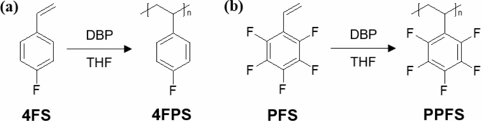 시약. Styrene monomer(St)와 di-tert-butyl peroxide(DBP)는 Sigma-aldrich(미국)에서 구입하였고 4-fluorostyrene(4FS, >98%)과 2,3,4,5,6-pentafluorostyrene(PFS, >98%)은 Tokyo Chemical Industry Company(일본)에서 구입하였다. Tetra- hydrofuran(THF)과 dichloromethane은 삼전화학(한국)에서 구입하였다. 실험에 사용한 모든 시약은 정제없이 그대로 사용하였다.