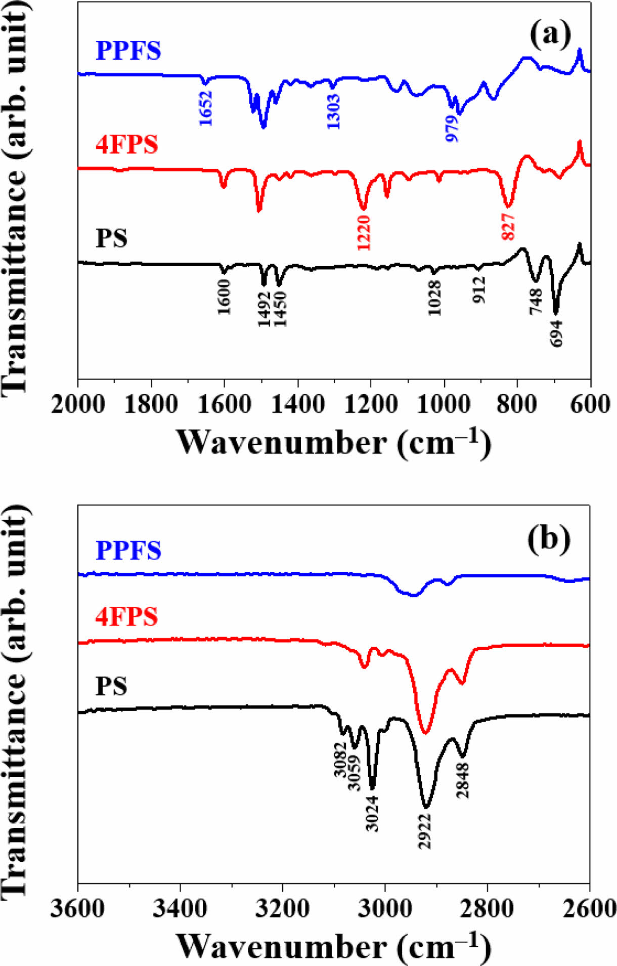 Figure 2는 PS, 4FPS, PPFS의 화학 결합 구조를 분석한 FTIR 결과이다. PS는 1600, 1492, 1450 cm-1에서 방향족 C=C 결합 구조, 1028과 912 cm-1에서 방향족 C-H 결합 구조를 가지는 것을 확인할 수 있다(Figure 2(a)). 또한, 3082, 3059, 3024 cm-1에서 방향족 C-H 결합 구조, 2922와 2848 cm-1에서 CH2 결합 구조가 관찰된다(Figure 2(b)).18,19 4FPS의 경우 Figure 2(a)에서 알 수 있듯이 1220과 827 cm-1에서 방향족 내 para 위치의 C-F 결합 구조가 나타난 것을 확인하였다.20,21 PPFS는 1652 cm-1에서 방향족 CF=CF 결합 구조, 979 cm-1에서 C-F 결합 구조를 가진다.22 또한, Figure 2(b)에서 4FPS와 PPFS는 PS에 비해 3100-2800 cm-1에서 방향족 C-H 구조와 CH2 결합 구조의 피크 강도가 약한 것을 알 수 있다. 이는 방향족 C-H 결합의 H가 F로 치환되어 생성된 방향족 C-F 결합구조로 인해 피크 강도가 감소한 결과이다. 이와 같이 FTIR 분석 결과를 통해 PS, 4FPS, PPFS가 제조된 것을 확인하였다.