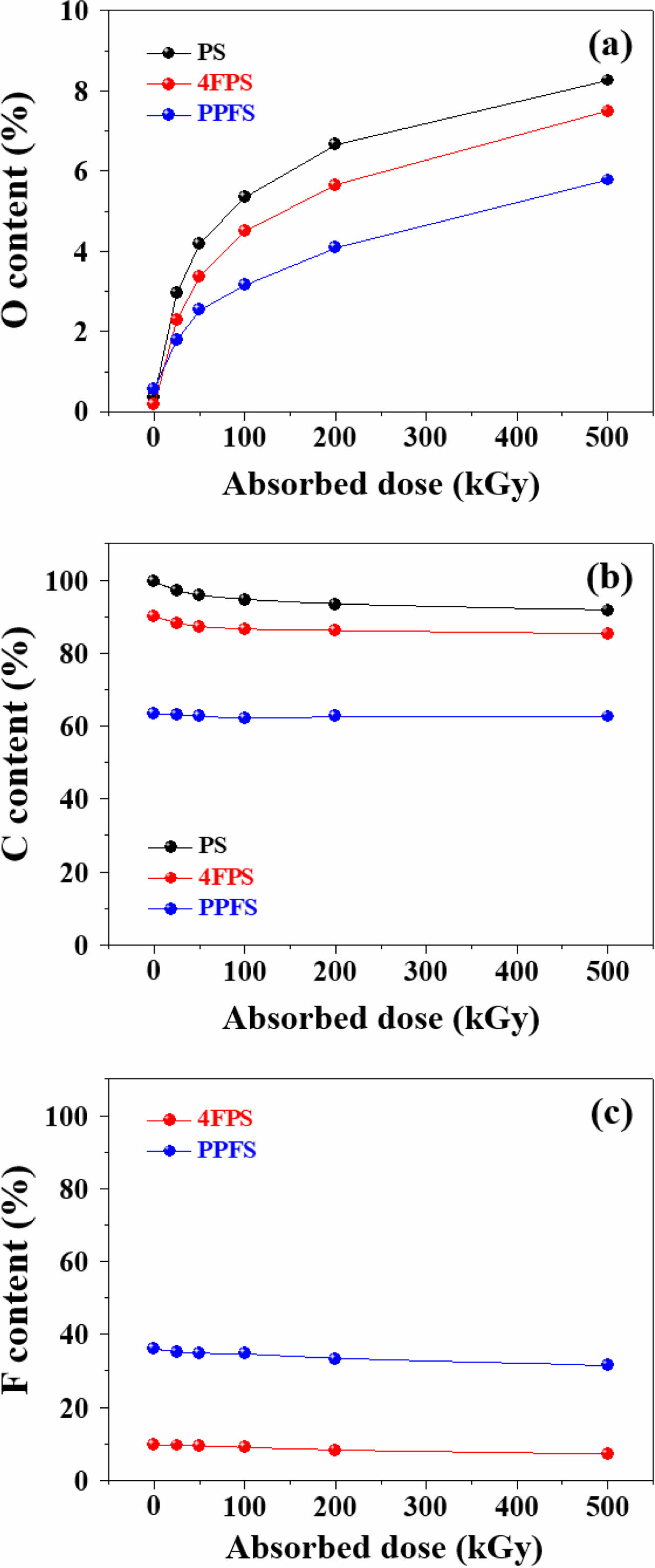 Figure 3 Changes in elemental composition of (a) oxygen; (b) carbon; (c) fluorine content in PS, 4PFS, and PPFS as a function of absorbed dose. |