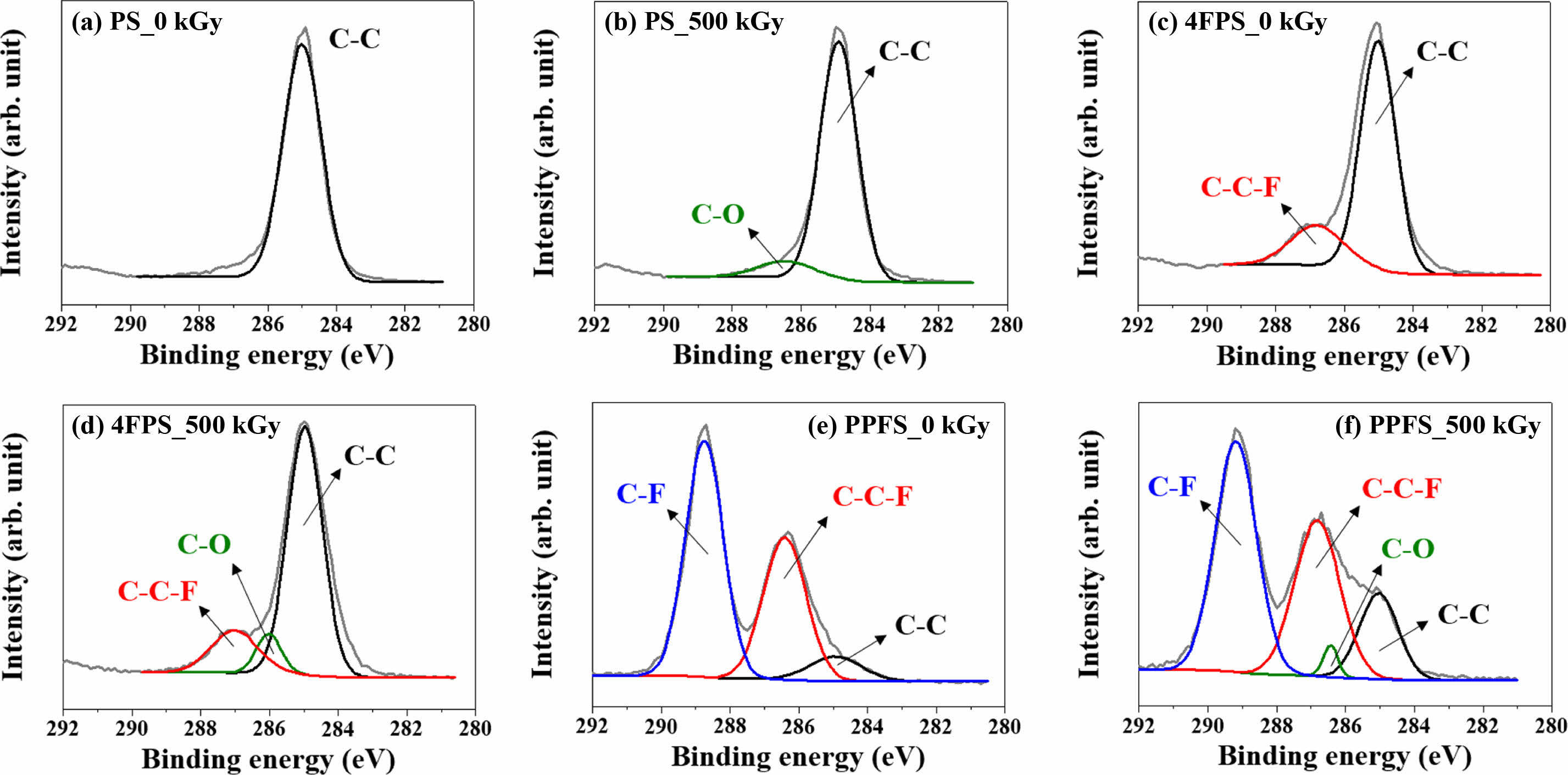 Figure 3은 감마선 흡수선량에 따른 PS, 4FPS, PPFS의 탄소, 산소, 불소의 함량 변화를 XPS survey 스펙트라로 분석하고 정리한 결과이다. Figure 3(a)에서 감마선을 조사하지 않은 PS, 4FPS, PPFS가 가지는 미량의 산소 함량의 경우 공기 분위기에서 XPS 분석을 실시하여 측정된 것으로 판단된다. 감마선 흡수선량에 따른 PS, 4FPS, PPFS의 산소 함량은 감마선 흡수선량이 증가함에 따라 증가하였으며 이는 공기 분위기에서 감마선 조사에 의해 공기 중의 산소와 라디칼이 반응하여 산소를 포함하는 관능기가 형성됨으로 인해 산화 반응이 일어난 것을 의미한다. PS는 25 kGy의 감마선 흡수선량에서 2.96%의 산소 함량을 보여 낮은 흡수선량에서 산화 반응이 비교적 많이 일어난 것을 알 수 있다. 반면에 불소를 포함하는 4FPS, PPFS의 경우 25 kGy의 감마선 흡수선량에서 각각 2.28, 1.78%의 산소 함량을 가지고 있으므로 PS에 비해 산화 반응이 덜 진행된 것으로 사료된다. 500 kGy의 감마선 흡수선량을 조사 후 PS, 4FPS, PPFS의 산소 함량은 각각 8.26, 7.49, 5.78%이었으며 이는 4FPS, PPFS의 구조 내 C-F 결합 구조의 존재로 인해 감마선 조사 시 방사선 내성을 가지므로 PS와 비교해 볼 때 산화 반응이 덜 진행된 것으로 사료된다. 또한, 감마선 흡수선량의 증가에 따른 산소 함량의 변화는 선형성을 가지지 못하며 감마선 조사 시 산화 반응은 초기 감마선 흡수선량에 의해 급격하게 진행된 후 감마선 흡수선량의 증가에 따라 계속 진행되는 것을 확인하였다.23 Figure 3(b)의 감마선 흡수선량에 따른 탄소 함량 분석 결과에서 감마선을 조사하지 않은 PS, 4FPS, PPFS는 각각 99.63, 90.06, 63.34%의 탄소 함량을 가지고 있었다. 감마선 흡수선량이 증가함에 따라 탄소 함량은 감소하여 500 kGy의 감마선 흡수선량 조사 후 PS, 4FPS, PPFS는 각각 91.74, 85.34, 62.65%의 탄소 함량을 가지고 있으며 탄소 함량 감소율은 각각 7.91, 5.24, 1.08%이었다. 또한, Figure 3(c)의 감마선 흡수선량에 따른 불소 함량 분석 결과 4FPS, PPFS는 각각 9.76, 36.09%의 불소 함량을 가지고 있으며 감마선 흡수선량이 증가함에 따라 불소 함량은 감소하여 500 kGy의 감마선 흡수선량 조사 후 4FPS, PPFS의 불소 함량은 각각 7.17, 31.57%로 감소하였다. 이와 같은 불소 함량의 감소는 방사선 조사에 의해 4FPS, PPFS의 탈불소화(defluorination)에 의한 것으로 사료된다.24,25