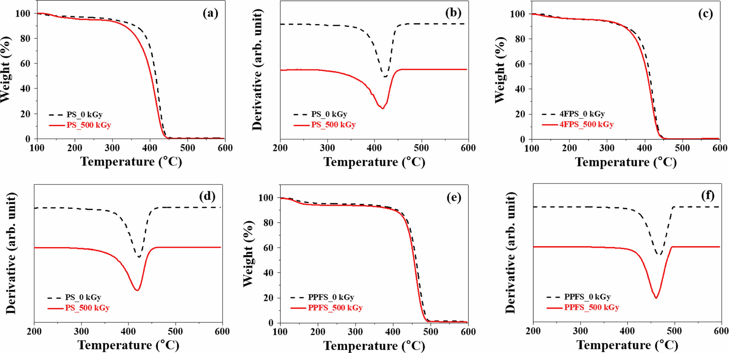Figure 5 TGA thermograms of (a) PS; (c) 4FPS; (e) PPFS; DTG curves of (b) PS; (d) 4FPS; (f) PPFS before and after gamma-ray irradiation. |