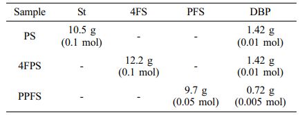 부분 불소화된 PS 제조.Polystyrene(PS), poly(4-fluoro- styrene)(4FPS), poly(pentafluorostyrene)(PPFS)은 Table 1의 조건에 의해 용액 중합(solution polymerization)으로 제조하였고 화학 구조는 Figure 1과 같다. 둥근 플라스크 반응기(100 mL)의 St, 4FS, PFS에 DBP와 THF를 투입하여 상온에서 30분 동안 교반한 후 질소분위기의 반응기에서 100 oC의 온도에서 18시간 동안 반응하였다. 제조한 반응물은 메탄올로 침전을 한 후 dichloromethane으로 정제한 다음 진공 오븐에서 60 oC의 온도에서 24시간 동안 건조하여 분말 상태의 PS, 4FPS, PPFS를 얻었다. PS, 4FPS, PPFS의 중량 평균 분자량(Mw)은 각각 75000, 96000, 112000이었다.