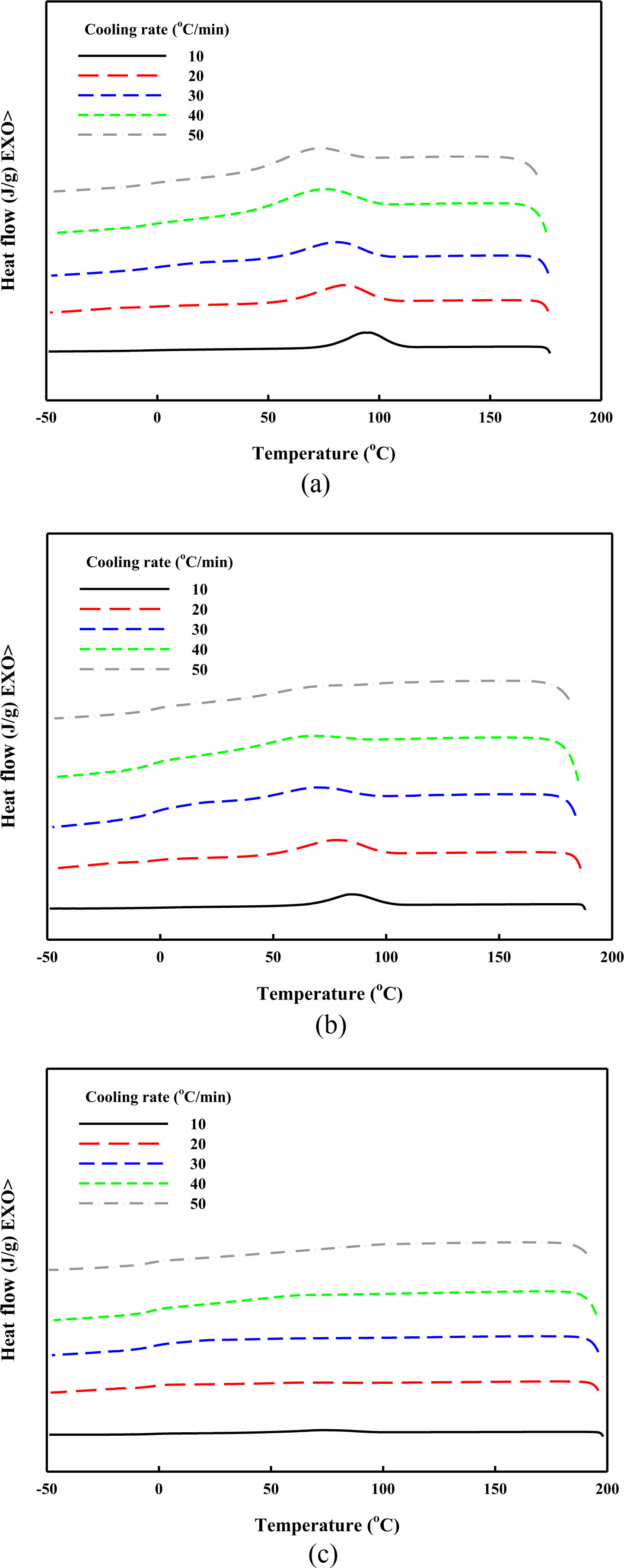 Figure 2는 180-200 oC로 DSC 승온 최대온도(용융 가공온도)를 올린 후 이를 10-50 oC/min로 냉각하여 얻은 DSC thermogram이다. 그림에서 보는 바와 같이 용융 가공온도에 따라 결정화 온도 및 엔탈피 변화가 일어남을 알 수 있다. 상대적으로 낮은 용융 가공온도인 180 oC에서는 냉각 조건에 따라 결정화 엔탈피 변화가 일어나는 반면, 용융 가공온도를 증가시키면 결정화 피크가 줄어들며 200 oC 용융 가공온도에서는 냉각속도와 관계없이 결정화 엔탈피가 모두 사라짐을 알 수 있다. 또한 용융 가공온도와 냉각속도에 따라 결정화 온도도 함께 변화됨을 알 수 있다. 이러한 결과는 용융 가공시 용융 가공온도가 P(3HB-co-4HB)의 비등온 결정화에 영향을 미침을 의미한다.