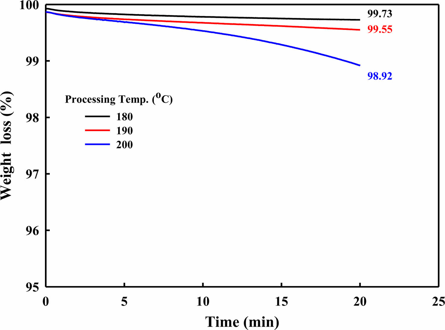 분석. 제공받은 P(3HB-co-4HB)의 열안정성을 확인하기 위하여 thermal gravity analyzer(TGA, TA Q50, USA)를 이용하여 180-200 oC에서 20분간 등온으로 유지한 후 질량 변화를 측정하여 가공온도에 따른 열안정성 변화를 무게 감소로 확인하였다.