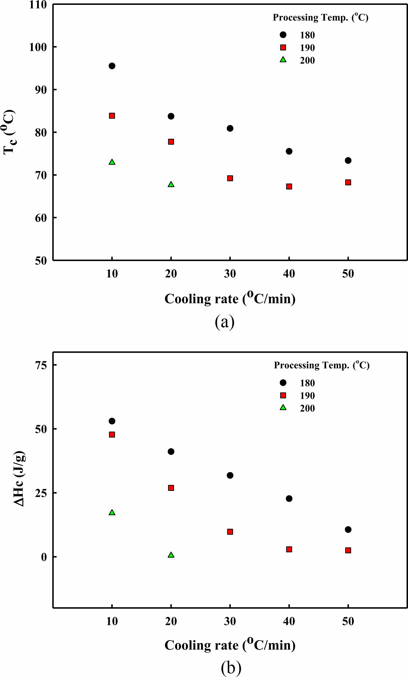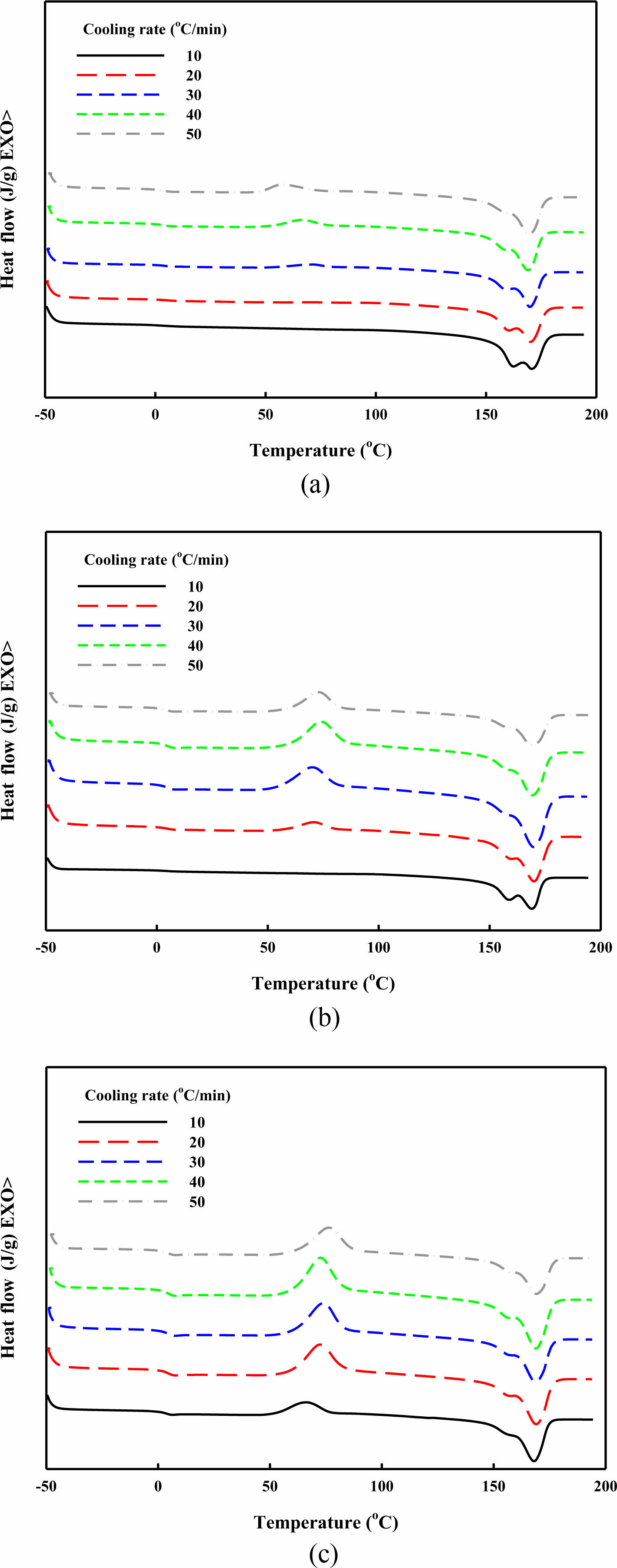 냉결정화 엔탈피는 비등온 냉각과정에서 완전하게 결정이 일어나지 못했던 결정들이 DSC에 의한 승온 열이력에 의하여 보다 열역학적으로 완전한 결정으로 변화되는 현상이다. 그림에서 보는 바와 같이 용융 가공온도를 증가시키면 열분해에 의하여 결정 형성에 어려움이 있고 특히, 냉각속도가 빠른 경우 불완전한 결정이 더 많이 발현되며 그 결과, 이들이 2차 승온 과정에서 보다 완전한 결정으로 재결정화가 다시 일어남을 알 수 있다.