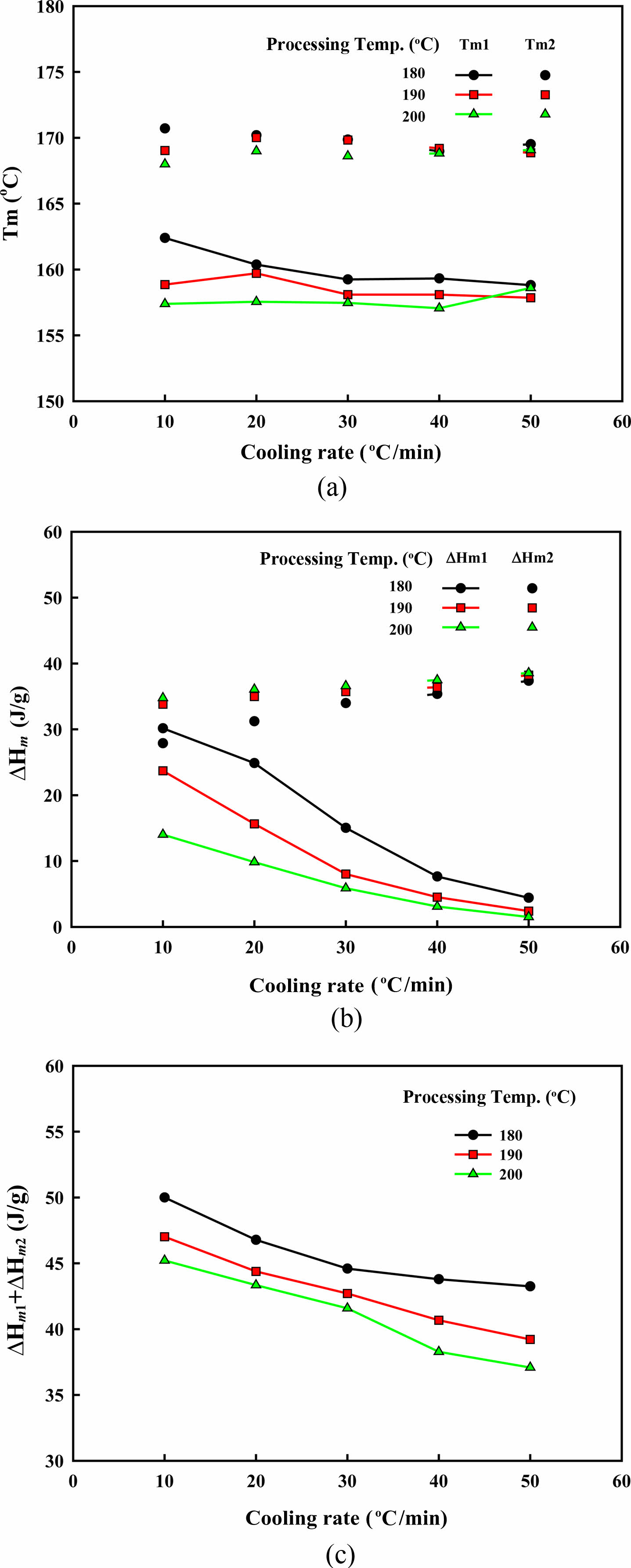 Figure 6(b)에 각각 결정의 용융 엔탈피 변화를 나타내었다. Figure 5에서 확인된 바와 같이 P(3HB-co-4HB)의 double 용융 피크는 용융온도의 차이가 10 oC 이내임에 따라 각각의 엔탈피의 중첩이 일어남에 따라 이를 분리하기 어려우나 double 피크의 변곡점으로부터 각각의 엔탈피를 확인하여 이를 Figure 6(b)에 나타내었다. 그림에서 보는 바와 같이 180 oC 용융 가공온도에서는 3HB rich phase에서 형성된 결정이 4 HB rich phase에서 형성된 결정보다 많아지나 용융 가공온도가 증가될수록 4HB에 기인되는 결정의 양이 현저히 줄어듦을 알 수 있다. 냉각속도가 결정 형성에 미치는 영향을 살펴보면 냉각속도가 증가됨에 따라 4HB rich phase의 결정 형성이 어려워지는 반면 3HB rich phase의 결정 형성은 더 많아짐을 알 수 있다. 냉각속도가 50 oC/min 즉, 급랭 조건의 경우에 형성되는 결정은 용융 가공온도와 상관없이 대부분 3HB rich phase에서 형성된 결정임을 알 수 있다.
