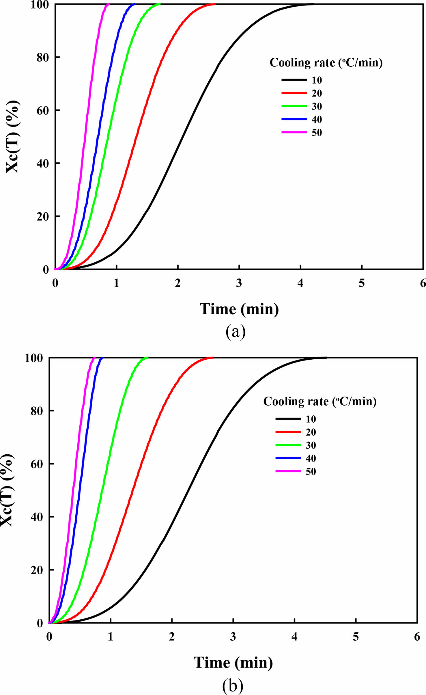 식 (6)에 의하여 각 냉각속도로부터 상대 결정화도를 시간에 따라 구하여 Figure 7에 시간에 따른 상대 결정화도 Xc(T)의 변화를 나타내었다. 200 oC 용융 가공에서는 본 연구에서 사용한 냉각속도 전 구간에서 비등온 결정화 엔탈피를 얻을 수 없어 180와 190 oC 용융 가공 온도에서 이들의 변화를 확인하였다. 냉각속도가 증가함에 따라 Xc(T)가 빨리 100%에 도달하는 것으로 보아 결정화 속도가 증가함을 알 수 있다. P(3HB-co-4HB)의 결정화는 전형적인 sigmoidal 결정화 거동을 보이며 결정화 초반의 기핵 형성에 따른 비선형적인 느린 결정화 거동과 함께 결정화 후반에서는 secondary crystallization에 의한 느린 비선형적인 결정화 거동을 보인다.
