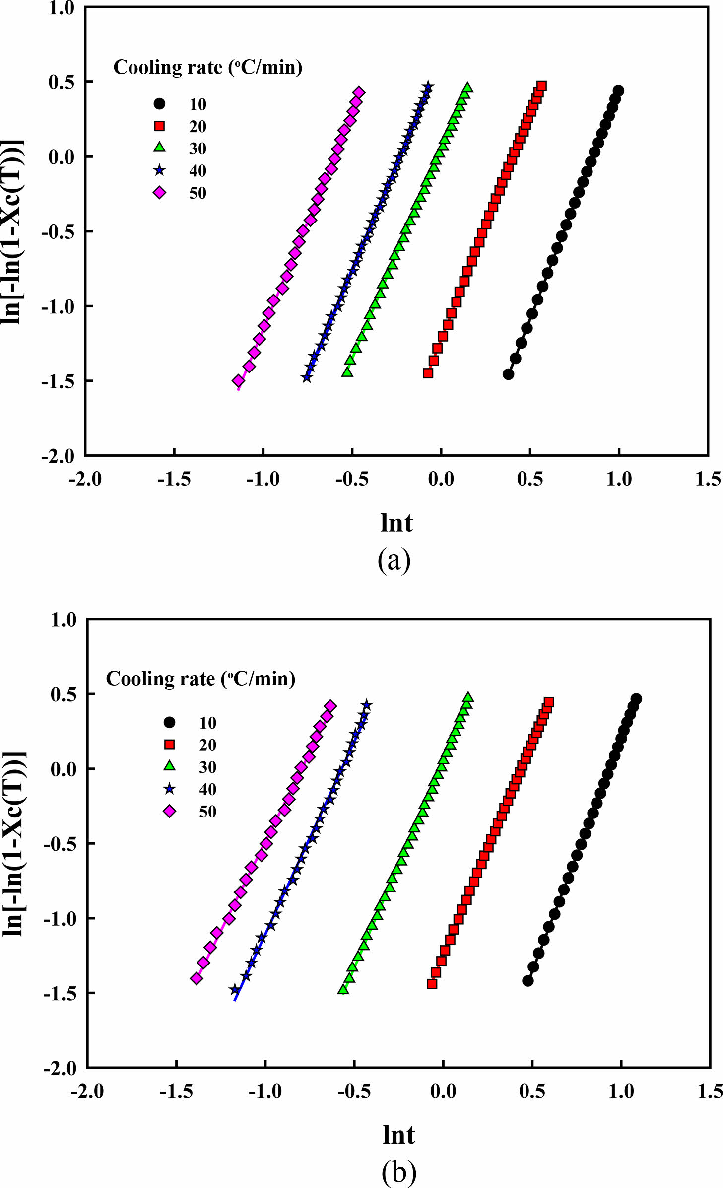 Avrami-Ozawa plots of P(3HB-co-4HB) with various processing temperature: (a) 180 oC; (b) 190 oC.