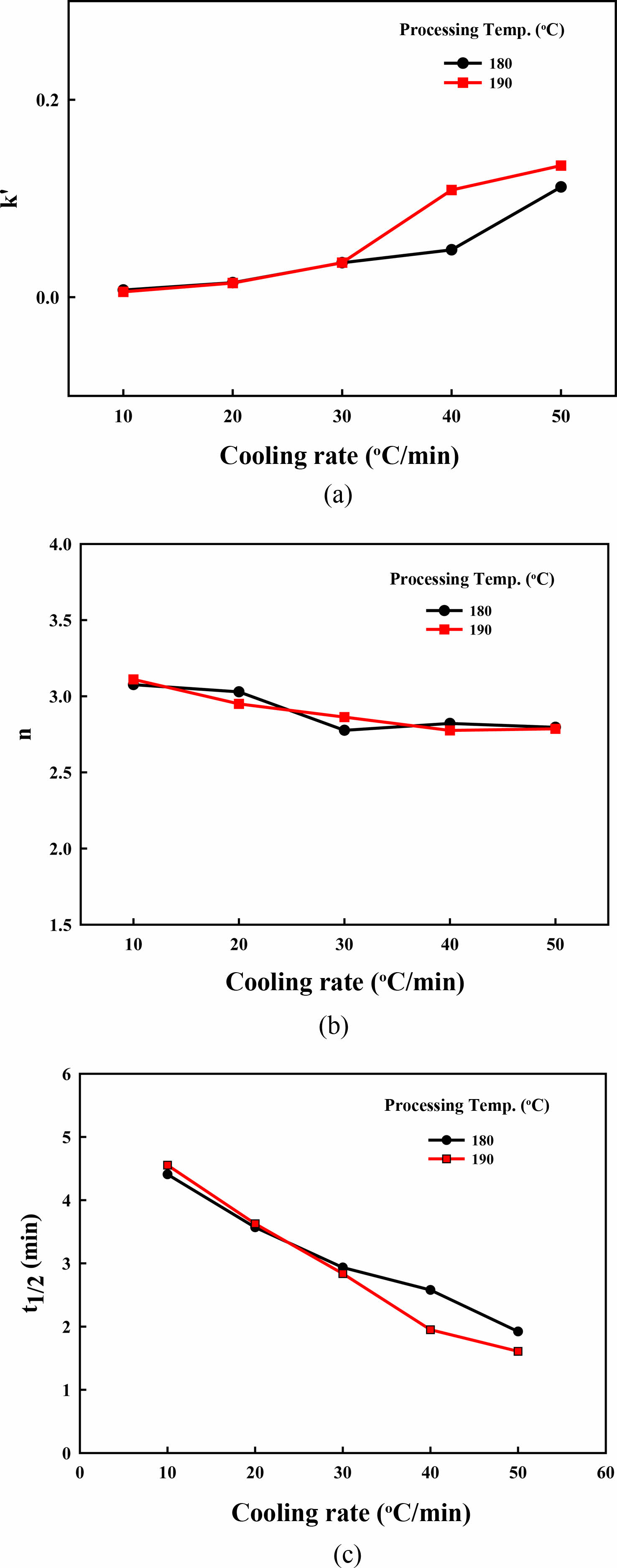 Figure 9(b)에 결정의 모양을 나타내는 n 값을 냉각속도 및 용융 가공온도에 따라 나타내었다. 그림에서 보는 바와 같이 n 값은 2.7-3.1 범위를 가짐에 따라 형성된 결정은 3차원적 구조를 가지고 있음을 알 수 있다. 냉각 속도가 증가됨에 따라 n값이 다소 감소하는 것으로 보아 급랭조건에서 형성된 3HB rich phase 영역에서 생긴 결정이 서냉에 의하여 3HB와 4HB rich phase에서 생긴 결정보다 열역학적으로는 더 안정하지만 Figure 9(a)에서 확인된 바와 같이 빠른 결정화 속도에 의하여 형태학적으로는 3차원적 구조적 형성이 다소 미흡하나 그 차이는 크지 않음을 알 수 있다. 용융 가공온도는 n 값에 크게 영향을 미치지 않는 것으로 보아 열분해에 의하여 생성된 저분자 P(3HB-co-4HB)에 의하여 P(3HB-co-4HB) 결정화, 특히, 4HB rich phase영역에서의 결정 형성은 어려워지나 결정의 3차원적 모양에는 큰 차이가 없음을 알 수 있다. Figure 9(c)에 구해진 k' 와 n값을 사용하여 이들의 crystallization half time을 나타내었다. 냉각속도가 증가됨에 따라 결정화 속도가 빨라짐을 보이며 용융 가공온도가 crystallization half time에 미치는 영향은 Figure 9(a)의 k'의 결과와 마찬가지로 냉각속도 30 oC/min 이상에서는 높은 용융 가공온도에서 3HB phase에서 형성되는 결정의 결정화 속도는 빨라짐을 알 수 있다.