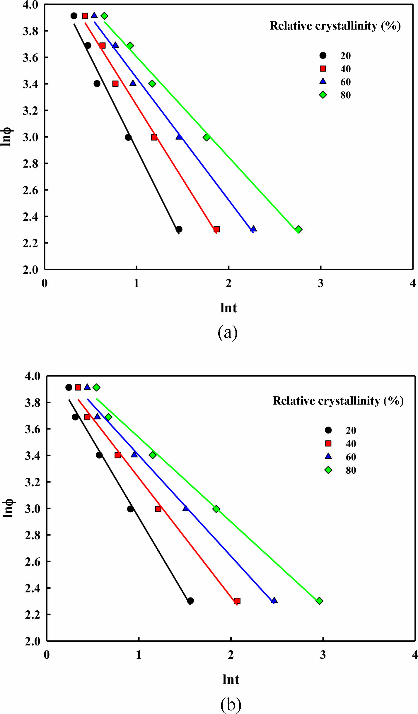 여기서 F(T)와 α는 lnФ와 lnt plot의 절편과 기울기로 각각 구할 수 있으며 F(T)는 [k''(T)/k]1/m을 나타내며 α는 Avrami 식과 Ozawa 지수의 비(n/m)를, F(T)는 결정화 어려움의 정도를 나타낸다.