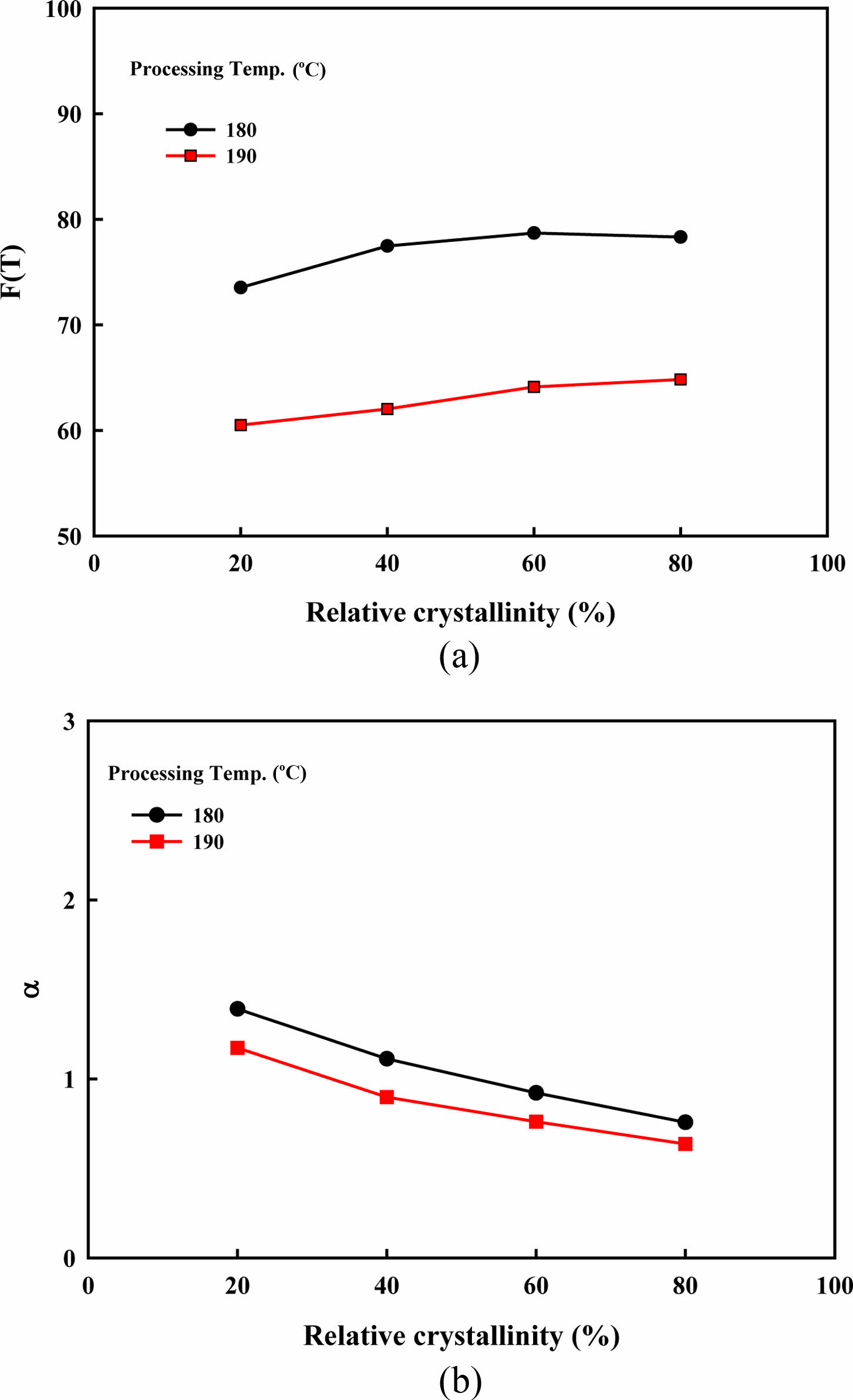 Figure 11(a)에서 보는 바와 같이 F(T) 값이 상대 결정화도와 관계없이 거의 일정한 것으로 보아 각 상대 결정화도에 도달하기 위한 결정화의 어려움의 정도 즉, 결정화 속도가 각 상대 결정화가 증가하는 과정에서 일정함을 알 수 있다. 180 oC 용용 가공에서의 F(T) 값이 높은 것으로 보아 낮은 용융 가공온도에서 결정화 속도가 느린 것을 알 수 있으며 이러한 결과는 Figure 9의 modified Avrami model과 잘 일치한다. Figure 11(b)의 α값은 상대 결정화도가 증가됨에 따라 감소됨을 보이며 결정화 온도가 증가됨에 따라 감소됨을 알 수 있다. 이는 각 결정화 정도와 용융 가공온도에서 등온과 비등온 결정화의 형태가 달라짐을 의미한다. Figure 6에서 확인한 바와 같이 P(3HB-co-4HB)는 각 냉각속도에 따라 4HB rich phase와 3HB rich phase에서 생겨나는 결정의 완전성이 다르며 이를 좌우하는 용융 가공온도 및 결정화 정도에 따라 결정의 형태가 등온 결정화와 비등온 결정화에서 달라짐을 의미한다.
