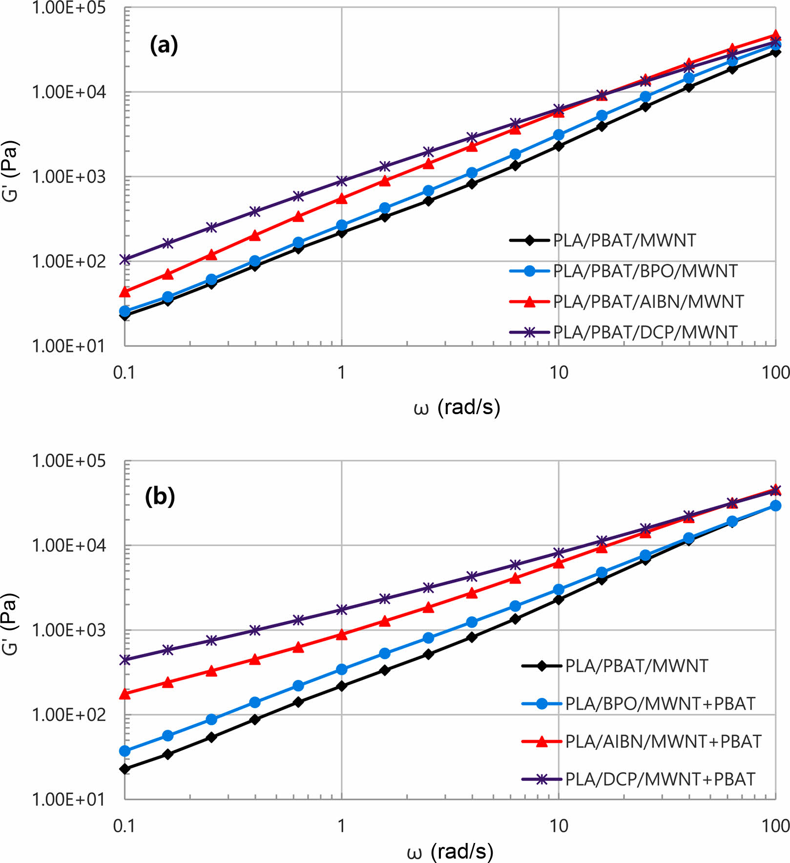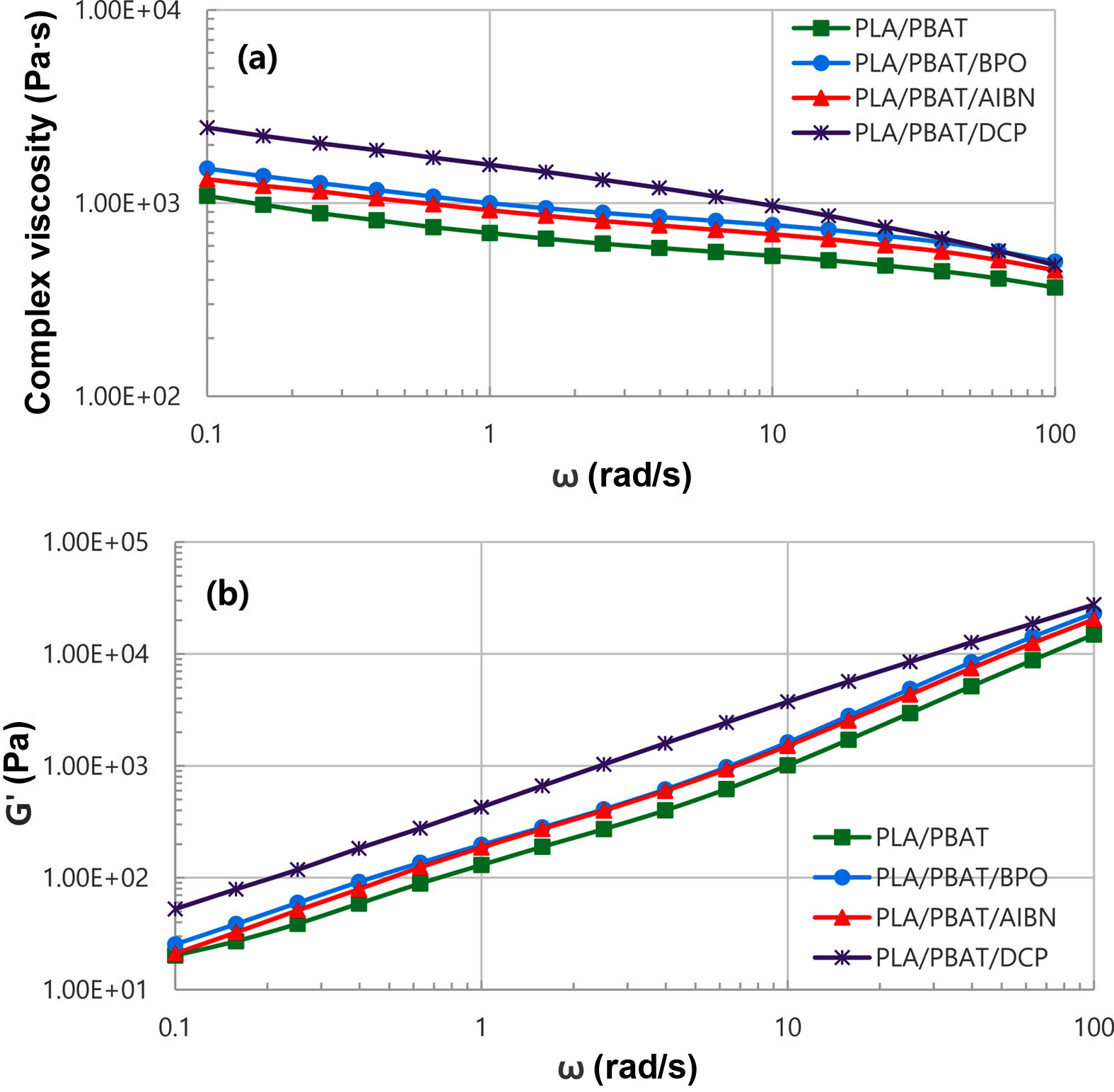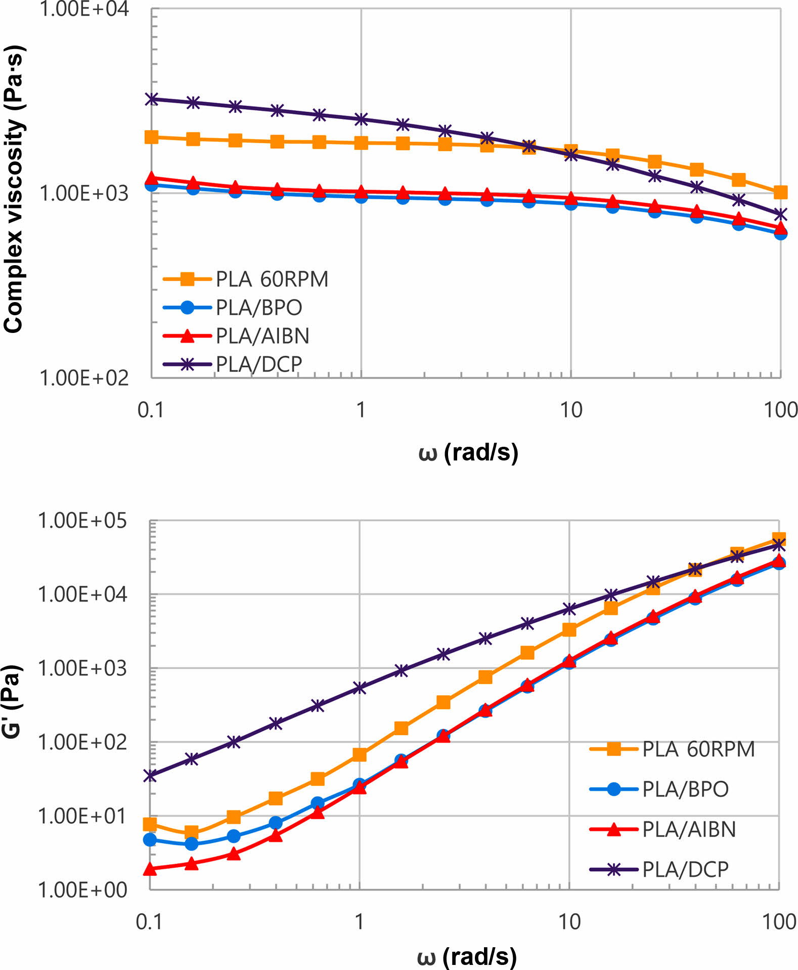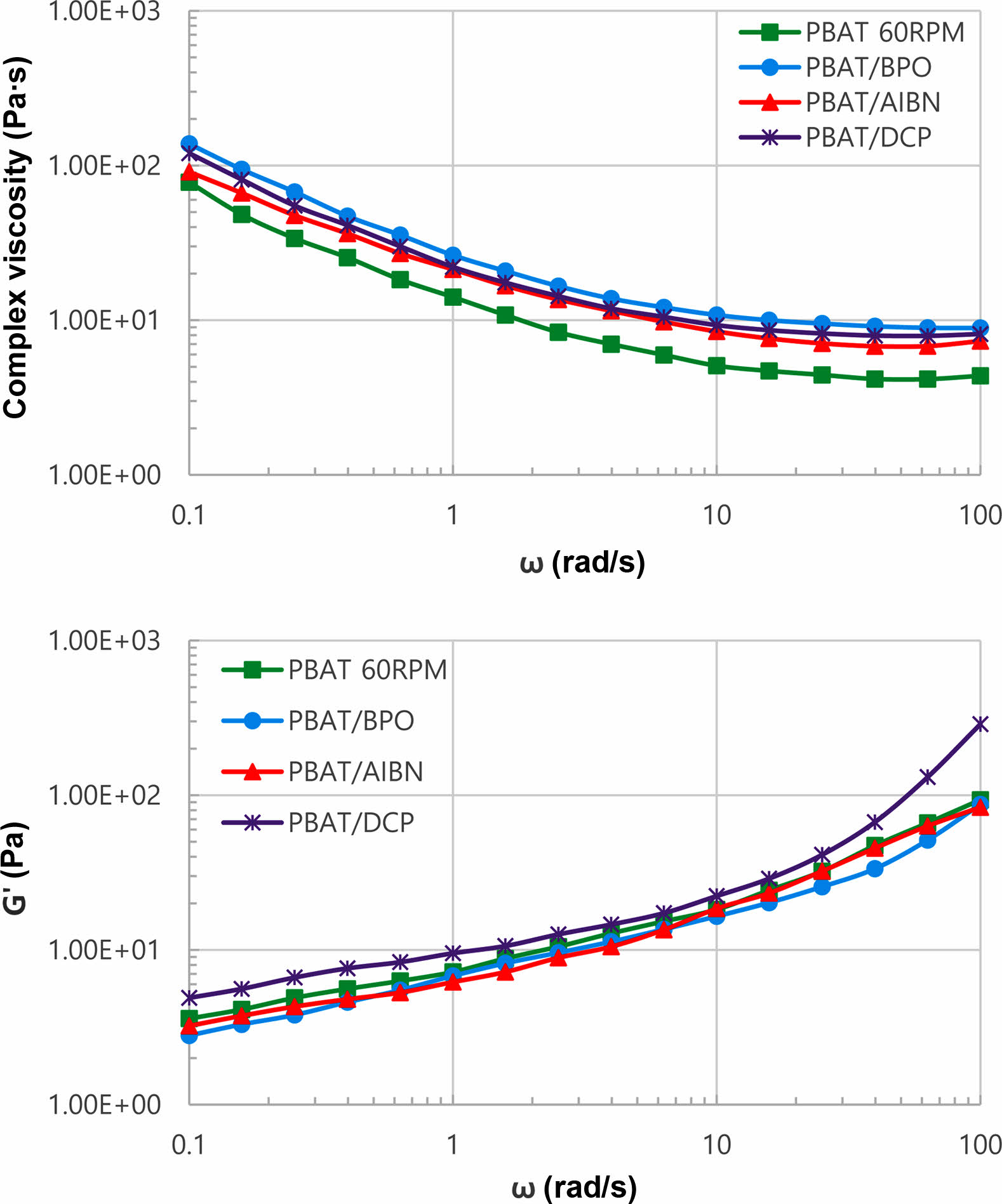 블렌드를 구성하는 고분자인 PLA와 PBAT의 용융 점도와 저장탄성률이 개시제에 의하여 어떻게 변화하는지를 Figures 1과 2에 나타내었다. 용융 가공이 순수한 PLA와 PBAT의 변성을 야기할 수 있으므로 각각 60 RPM에서 10분간 가공한 후 유변 물성을 측정하여 비교하였다. PBAT의 용융 가공은 수지의 용융온도(110-115 oC)를 감안하여 130 oC에서 진행하였다. PLA의 경우에는 개시제의 종류에 따라 상반된 결과를 나타내었는데, BPO와 AIBN에 의하여 용융 점도와 저장탄성률이 감소되는 반면 DCP에 의하여 저장탄성률과 용융 점도가 증가하고 전단 박화가 심화되는 결과를 보였다.