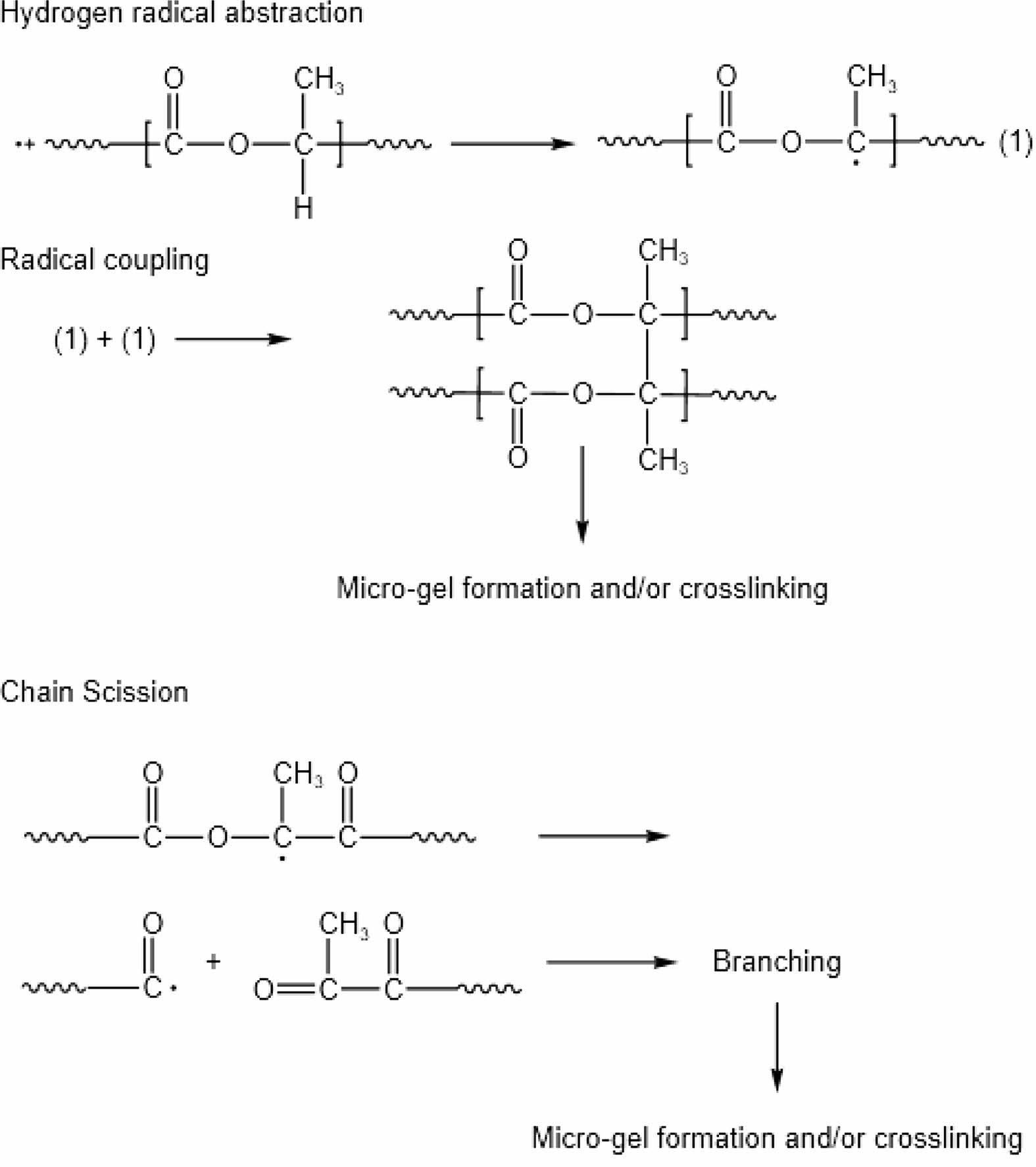 개시제와의 용융 혼련 후에 고분자의 용융 점도가 감소되는 현상은 고분자 사슬에 생성된 라디칼에 의한 사슬 끊어짐과 관련이 있으며, 용융 점도가 증가되는 현상은 개시제에서 분해된 라디칼들이 고분자에서 수소를 탈취하고 이어서 생성되는 고분자 라디칼들의 결합에 의하여 형성되는 부분적인 가교와 관련이 있다(Figure 3 참조).