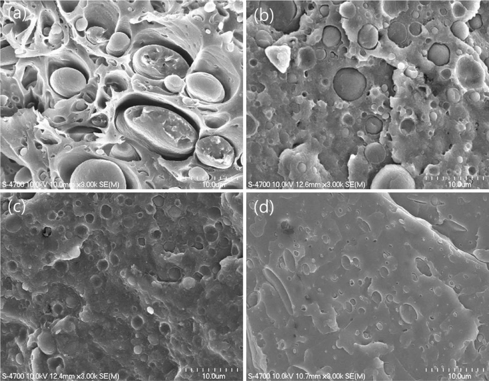Figure 4 SEM images of (a) PLA/PBAT (Rv=3.6±0.5 μm); (b) PLA/PBAT/BPO (Rv=1.8±0.1 μm); (c) PLA/PBAT/AIBN (Rv= 1.0±0.4 μm); (d) PLA/PBAT/DCP (Rv=1.0±0.4 μm). |