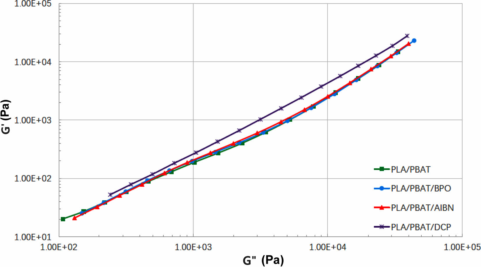 잘 알려진 바와 같이 진동모드에서 측정된 유변 물성은 주어진 고분자의 형태학과 분자 구조에 따라 민감하게 달라지게 되는데, 특히 modified Cole-Cole plot은 블록 공중합체와 고분자 블렌드의 미세구조 분석에 활용될 수 있고, 고분자의 분지구조 형성 및 분자량 분포 변화를 확인할 수 있는 유용한 방법을 제공한다.24-26 예를 들어, 순수한 고분자에서 장쇄 분지 또는 젤 형성에 의하여 고분자의 구조가 변환되면 분자량 분포가 넓어지고 분자량이 증가하는 효과로 동일한 G'' 값에 대한 G'값이 증가한다.26 따라서 Figure 5에 나타난 결과는 PLA와 PBAT의 용융 혼련 도중에 DCP에 의하여 유도되는 고분자의 구조변화와 관련이 있는 것으로 판단된다. 개시제의 도입으로 PLA-PBAT의 라디칼 결합으로 인하여 공중합체가 형성되어 상용성이 개선되었는데, DCP의 경우에는 그 과정에서 그라프트 또는 가교에 의한 분자 구조의 변환이 이루어져 다른 블렌드에 비하여 G' 값이 가장 높게 나타난 것으로 해석된다. BPO와 AIBN에 비하여 수소 탈취 능력이 우수하고 생존 시간이 긴 DCP는 용융 혼련이 진행되는 동안 대부분의 과정에 관여할 수 있으며 아직 반응하지 않았거나 이미 반응하여 구조가 변형된 고분자들의 가교 또는 그라프트 반응을 추가적으로 유도할 수 있다.