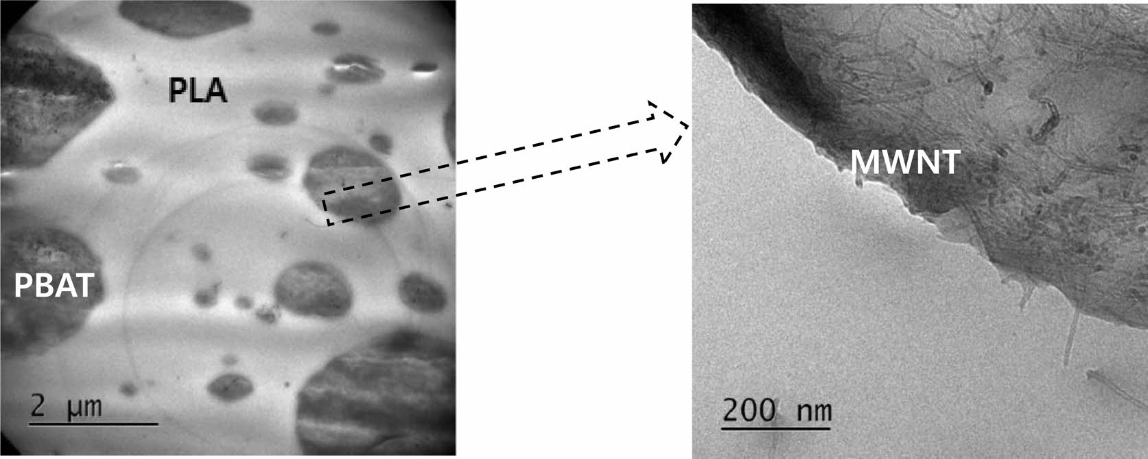 Free radical initiators were introduced in the melt-mixing of polylactic acid (PLA), poly (butylene adipate-co-terephthalate) (PBAT), and multi-walled carbon nanotube (MWNT). In PLA/PBAT/MWNT composite, MWNTs were preferentially located in the PBAT phase. When radical initiators were present, the nanotubes were also found in the PLA phase, because of the coupling reaction between PLA and MWNT.