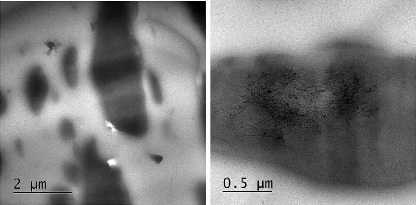 Figure 7 TEM images of PLA/PBAT/MWNT (Rv=2.2±0.1 μm). |