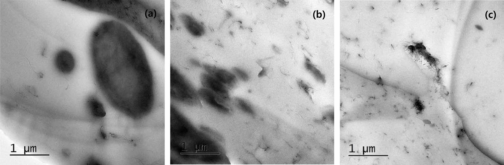 Figure 11 TEM images of PLA/Initiator/MWNT+PBAT: (a) BPO; (b) AIBN; (c) DCP. |