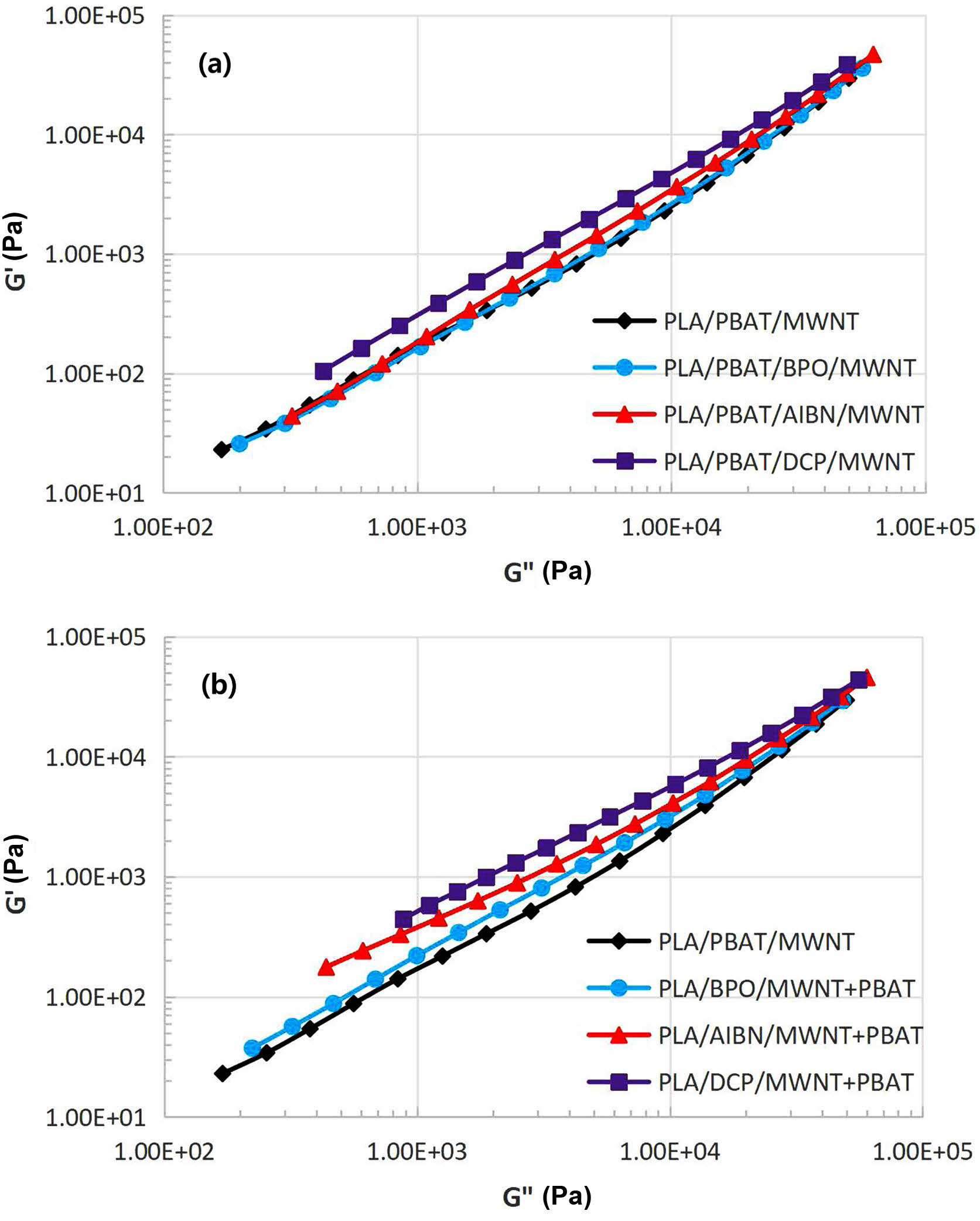 Figure 12 Effect of radical initiators on the storage moduli of (a) PLA/PBAT/Initiator/MWNT composites; (b) PLA/Initiator/MWNT +PBAT. |