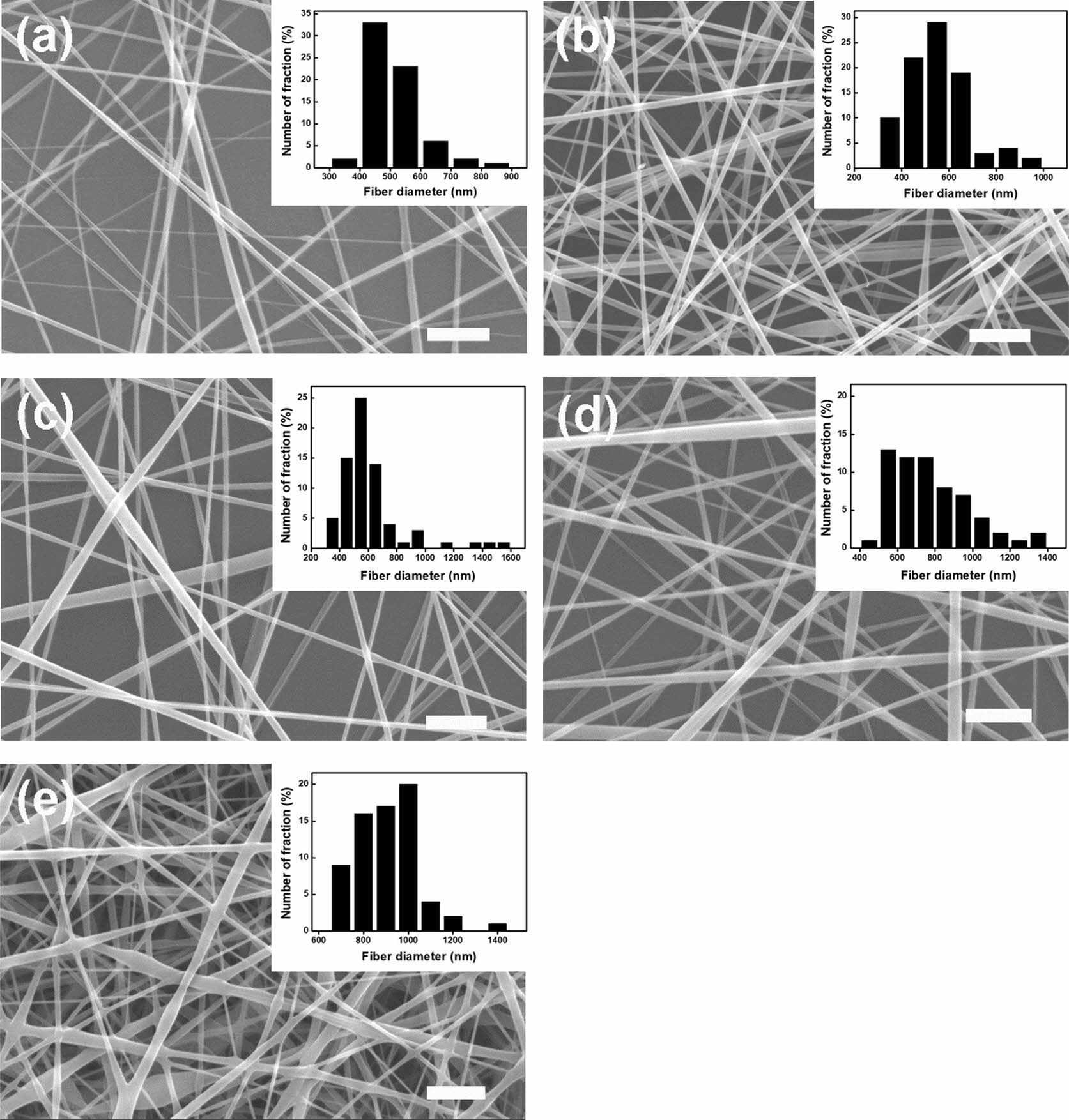 Figure 2 SEM images of P/g/CF scaffolds with different CF concentrations of (a) 0; (b) 1; (c) 2; (d) 3; (e) 4 wt%. Note that the P/ g ratio is 7/3, the scale bar is 5 m and the inset bar graph is a measure of the fiber diameter. |