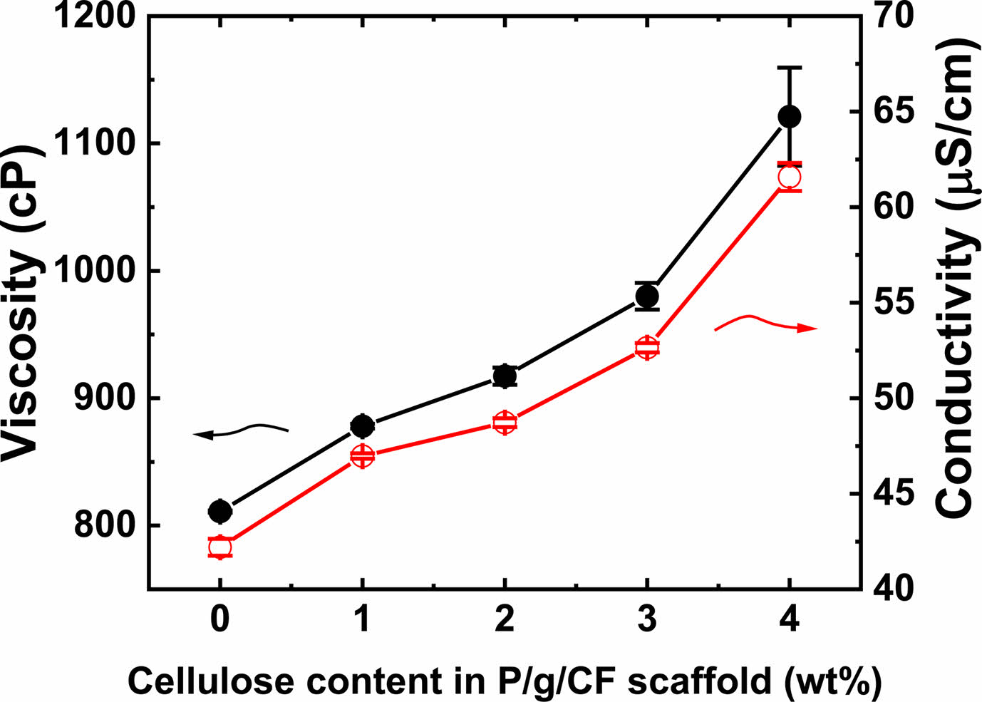Figure 4 The variation of viscosity and electrical conductivity as a function of CF content in P/g/CF scaffold. |