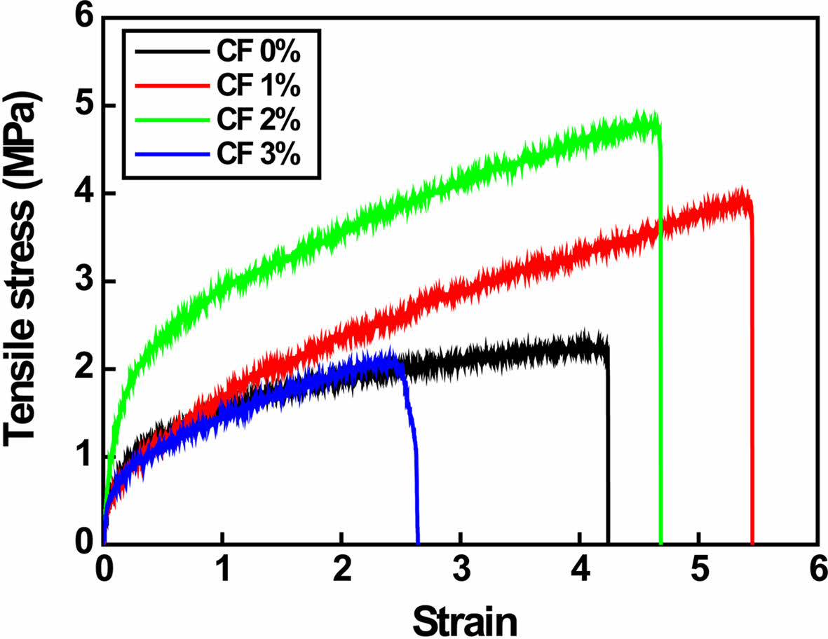 Tensile strength of P/g/CF scaffolds are illustrated in Figure 5. As the CF content increased from 0 to 1 wt%, the strain increased from 4.2 to 5.4. It then started to decrease from 5.4 to 4.6 and 2.5 with additional CF doping (2-3 wt%). Tensile strength increased dramatically from 2.2±0.3 to 3.9±0.5 MPa and 4.8±0.8 MPa with increasing CF content from 0 to 1 and 2 wt%, but decreased to 2.1±0.5 MPa with further CF doping (3 wt%). This can be detrimental to PCL crystallinity due to the non-uniform distribution of CF fillers and strong hydrogen bonding between gelatin and CF.5 Gourdarzi et al.5 reported that the highest strength of 3.24±0.22 MPa was observed for the P/g/CF scaffold containing 2 wt% CF, which is in good agreement with our results. However, our results (4.8±0.8 MPa) are slightly higher due to different sample preparation procedures. The degassing process was supplemented to obtain a homogeneous precursor solution. Optimized strength and strain were observed for P/g scaffold loaded with 2 wt% CF.