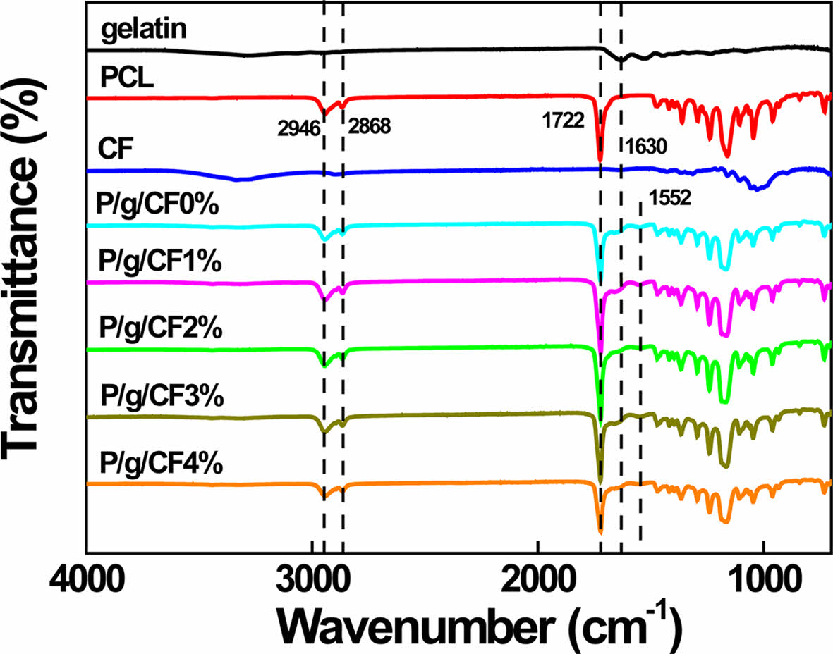 Figure 6 FTIR spectra of gelatin, PCL, cellulose fiber, and various P/g/CF scaffolds. |