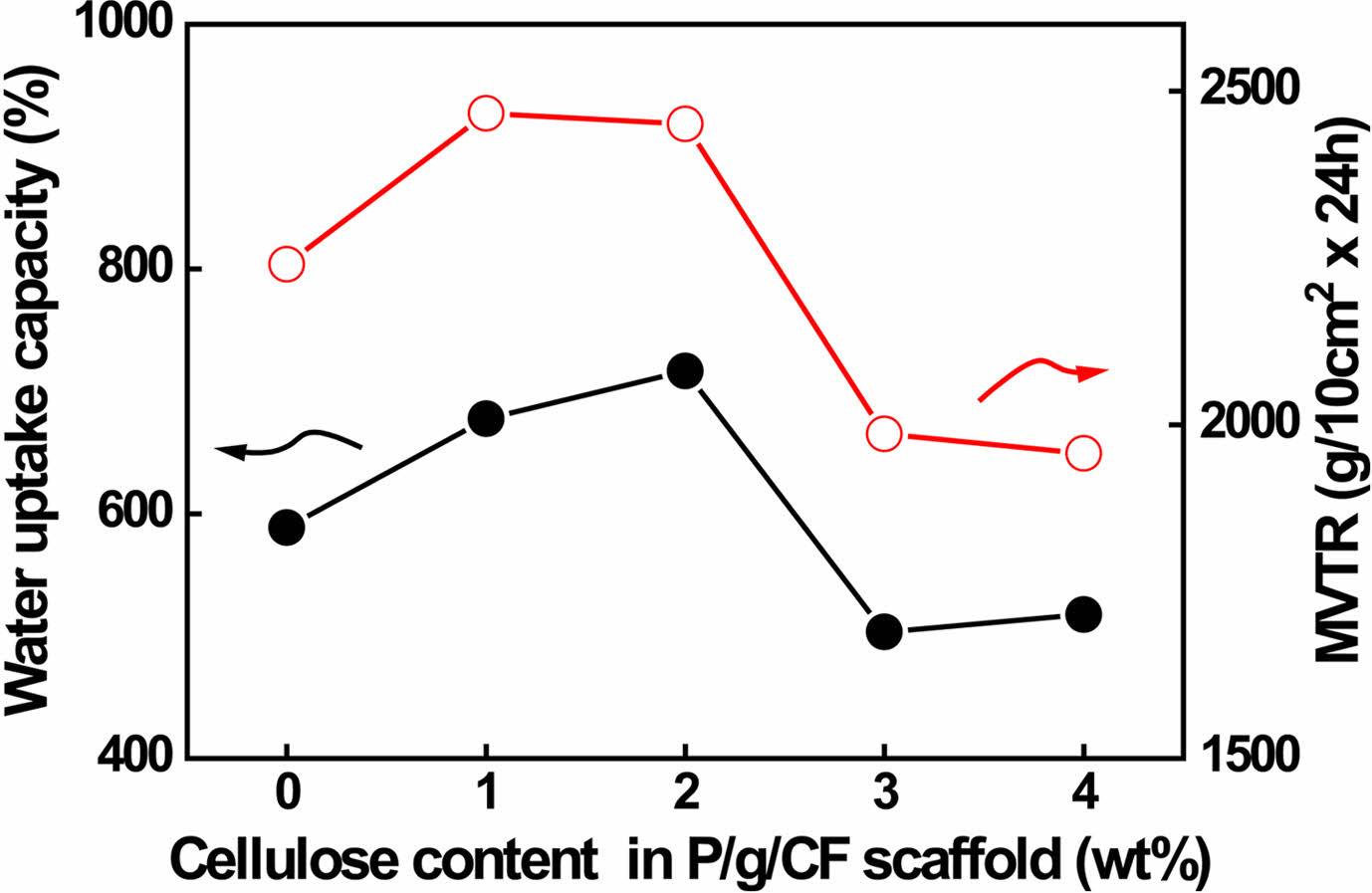 Figure 7 Water uptake capacity and MVTR values of various P/g/ CF scaffolds. |