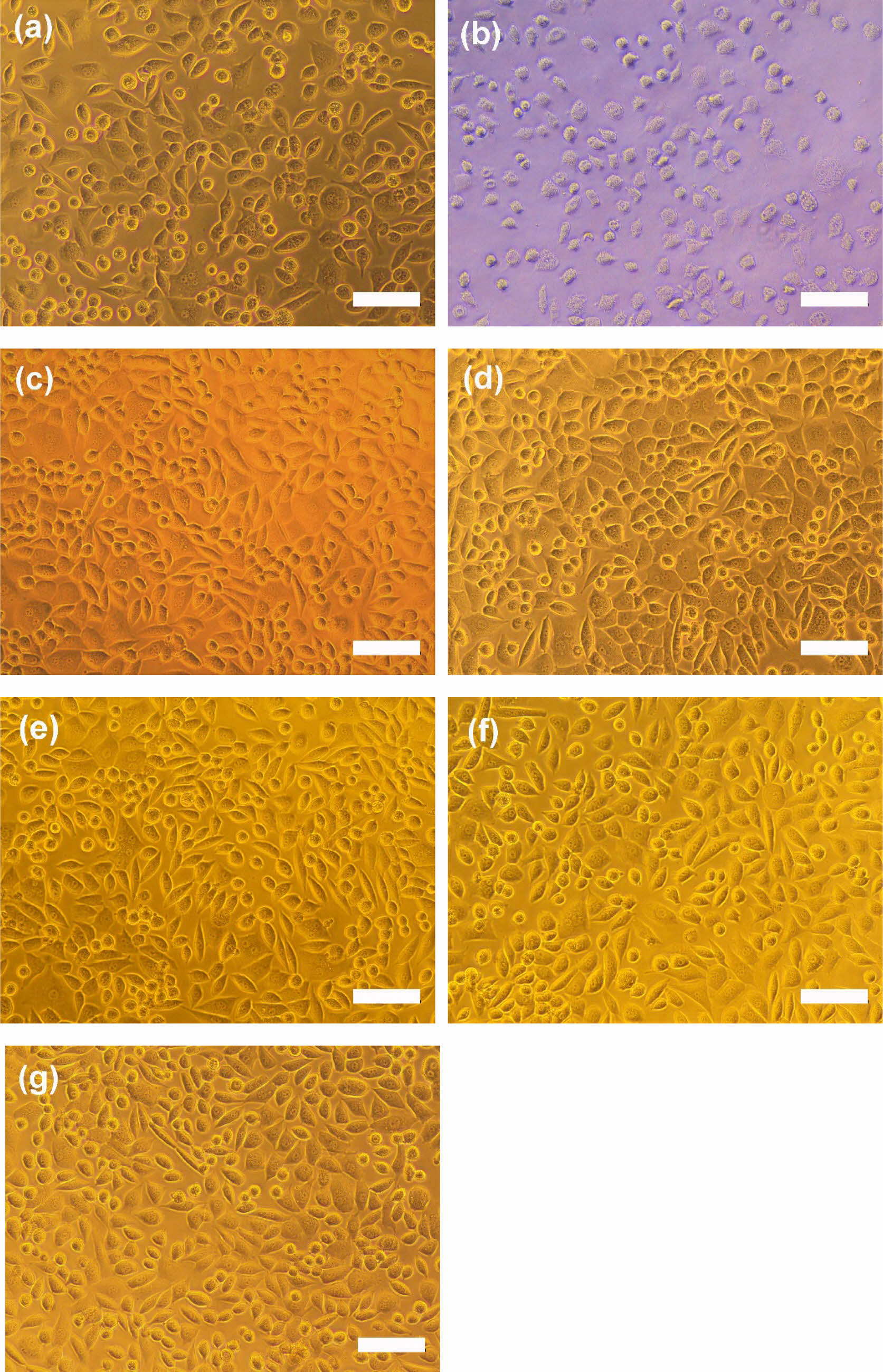 Figure 8 Photographs of cell morphologies: (a) negative control; (b) positive control; P/g/CF scaffolds containing (c) 0%; (d) 1%; (e) 2%; (f) 3%; (g) 4% CF content. Scale bar is 100 μm. |