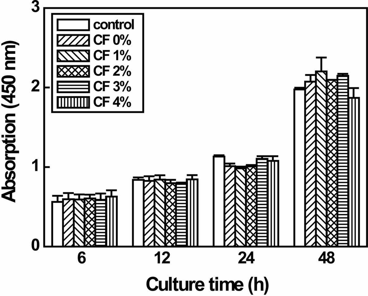 Cytotoxicity of P/g/CF scaffolds with varying CF content ranging from 0 to 4% determines whether the scaffold will have toxic effects on living cells.10-20 Regardless of the CF content, the test extracts showed no evidence of causing cell lysis or toxicity, as displayed in Figure 8. P/g/CF scaffolds containing CF content of 0, 1, 2, 3, and 4 wt% showed cell viability of 130, 121, 114, 135, and 136%, respectively, compared to the negative control, as measured at a wavelength of 415 nm by using the microplate absorbance spectrophotometer.10-14 As shown in Figure 9, the results of proliferation of L-929 cells on P/g/CF scaffolds suggested that L-929 cells adhered well to P/g/CF scaffolds and continued to proliferate over time. All P/g/CF scaffolds can be considered suitable as wound dressings because they are non-cytotoxic and have excellent cell adhesion and proliferation under the conditions of this study. As a result of the experiment, the P/g scaffold loaded with 2 wt% CF was determined as the optimal membrane due to the mechanical properties, physical properties, and biocompatibility.