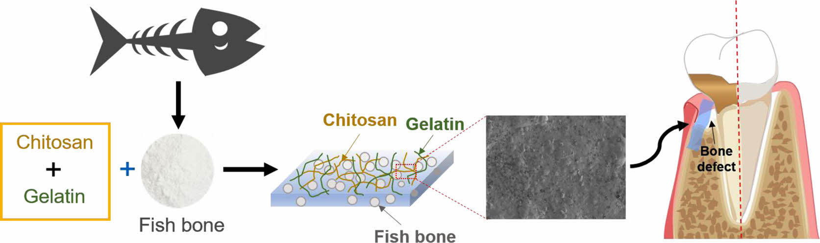 A schematic illustration of the gelatin-chitosan membrane containing fish bones for guided bone regeneration.