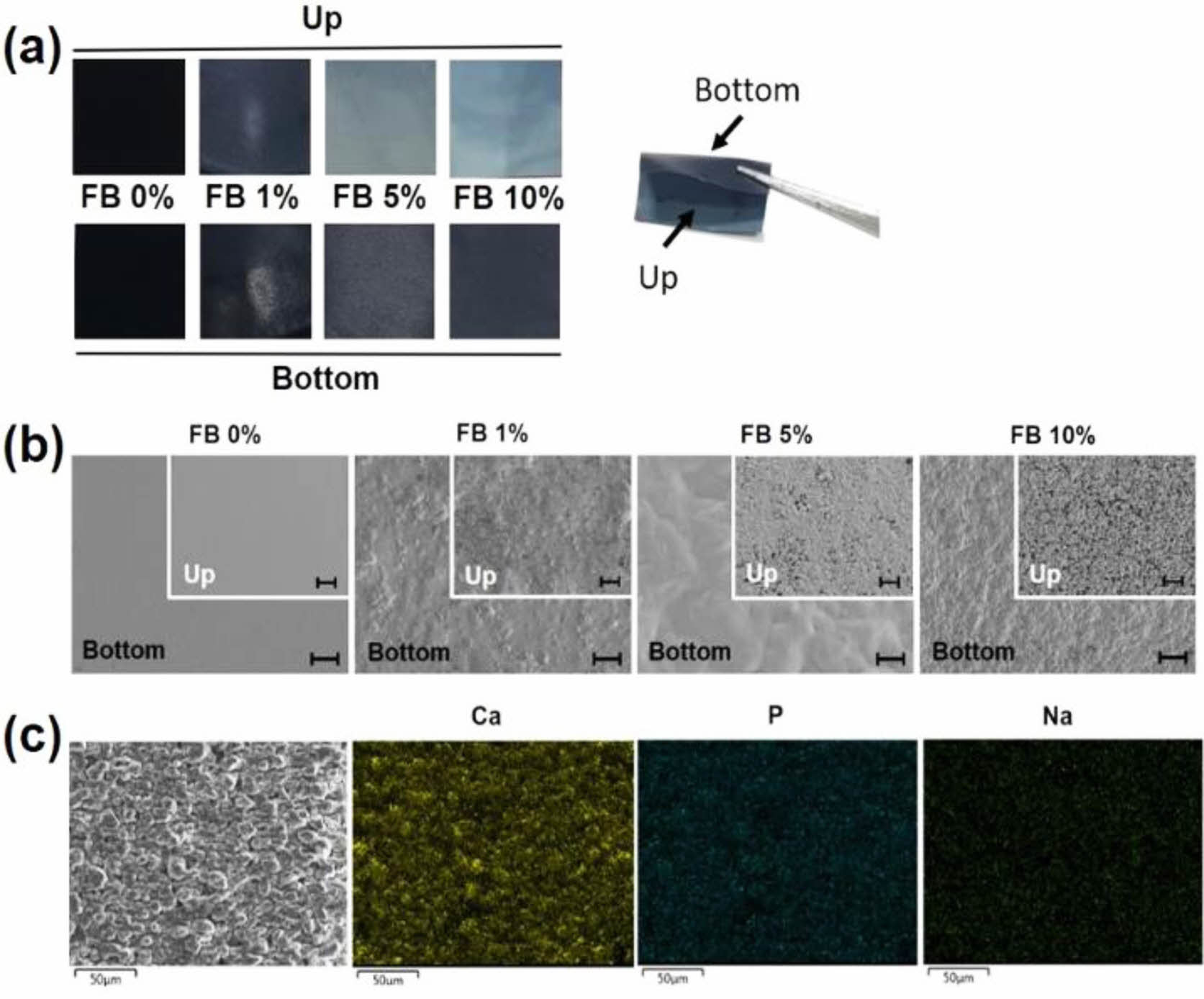Characterization of gelatin-chitosan membrane containing different amount of fish bone (FB): (a) Photographs of gelatin-chitosan membrane containing FB; (b) field emission scanning electron microscopic images of gelatin-chitosan membrane containing FB (scale bar=40 µm); (c) energy dispersive X-ray spectroscopic images of gelatin-chitosan membrane containing FB (10% w/w).