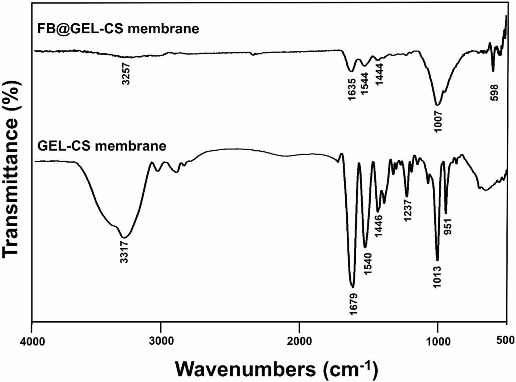 FTIR spectra of fish bone-loaded gelatin-chitosan (FB@GEL-CS) membrane and gelatin-chitosan (GEL-CS) membrane.