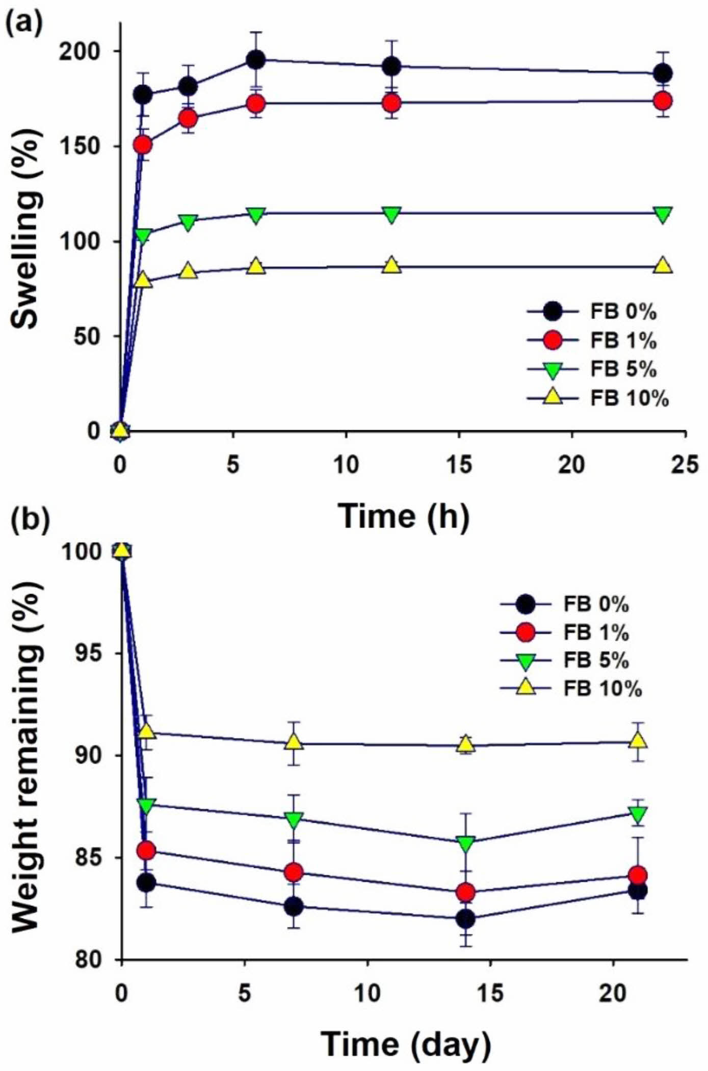 Swelling and weight remaining properties of gelatin-chitosan membrane crosslinked with genipin at various amount of fish bone (FB).